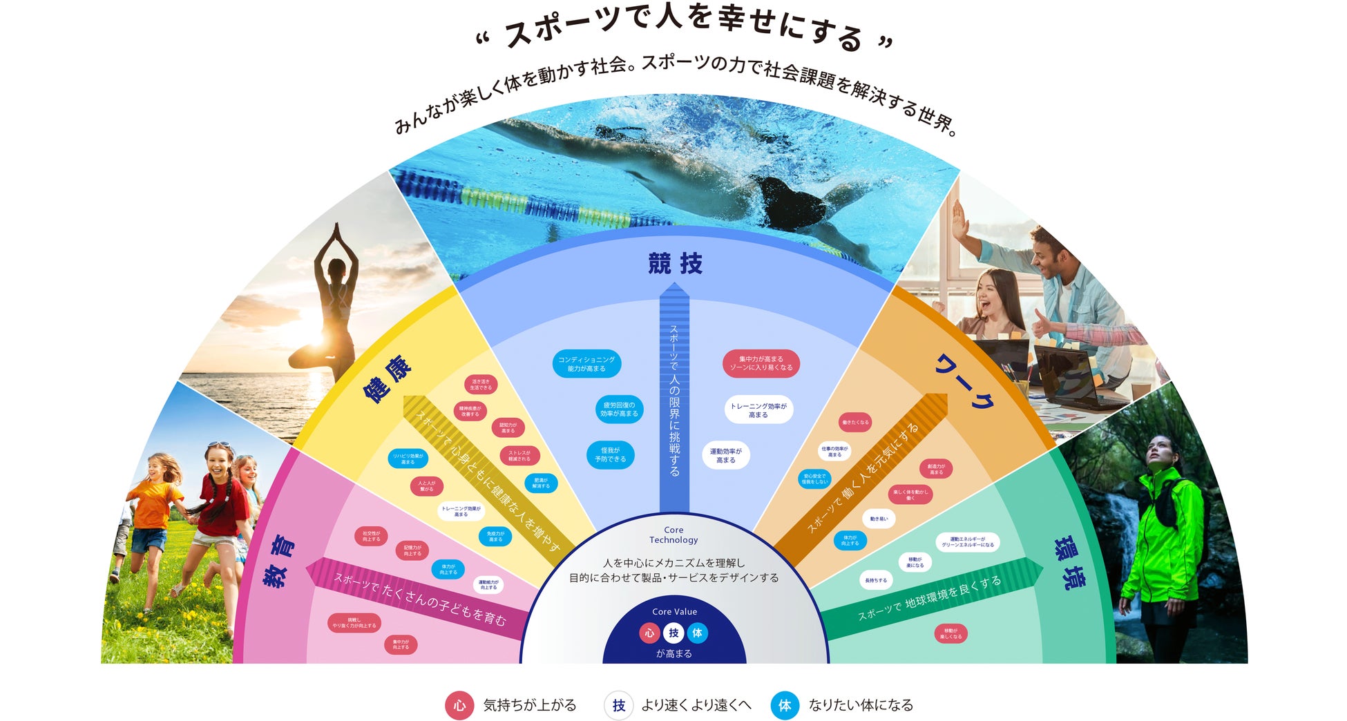 ミズノでは、スポーツを「楽しく体を動かすこと」と定義し、「スポーツで人を幸せにする」ことを使命としています。ミズノが描く未来は「みんなが楽しく体を動かす社会」「スポーツの力で社会課題を解決する世界」です。そのために人を中心にメカニズムを理解し、目的に合わせて商品・サービスをデザインする技術を用い、「人の心技体が高まる」という価値を提供することに注力していきます。