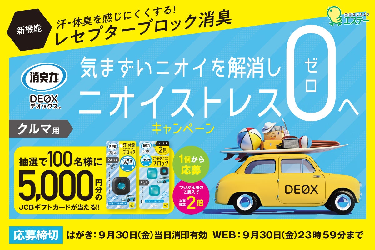 エステー株式会社は、日ごろの感謝を込めて、また夏の時期の車内のニオイが気になるシーズンに向けて、抽選で100名様に5,000円分のJCBギフトカードが当たる「気まずいニオイを解消しニオイストレス0(ゼロ)へキャンペーン」を実施します。