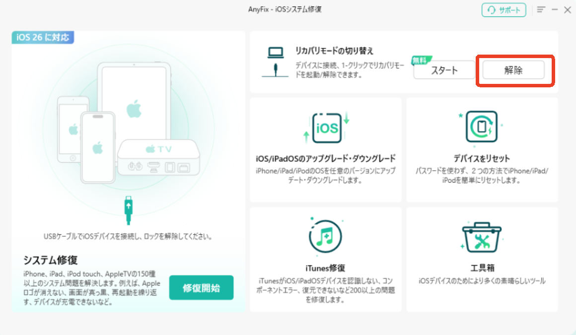 Step2.AnyFix を開き、メイン画面の 「リカバリーモードの切り替え」で「解除」をクリックします。