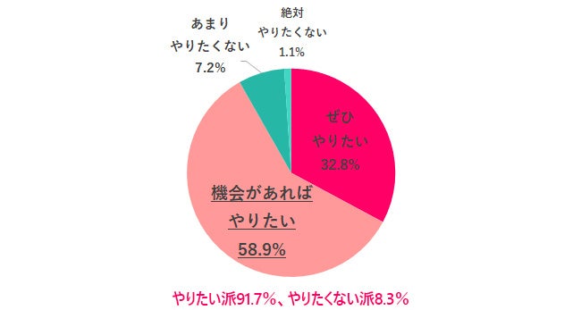 一方、副業経験がない人に今後副業をやってみたいか聞いてみると「機会があればやりたい」が58.9%で1位という結果に。2位「ぜひやりたい」32.8%と合わせると、副業に前向きな人が9割以上いることがわかります。