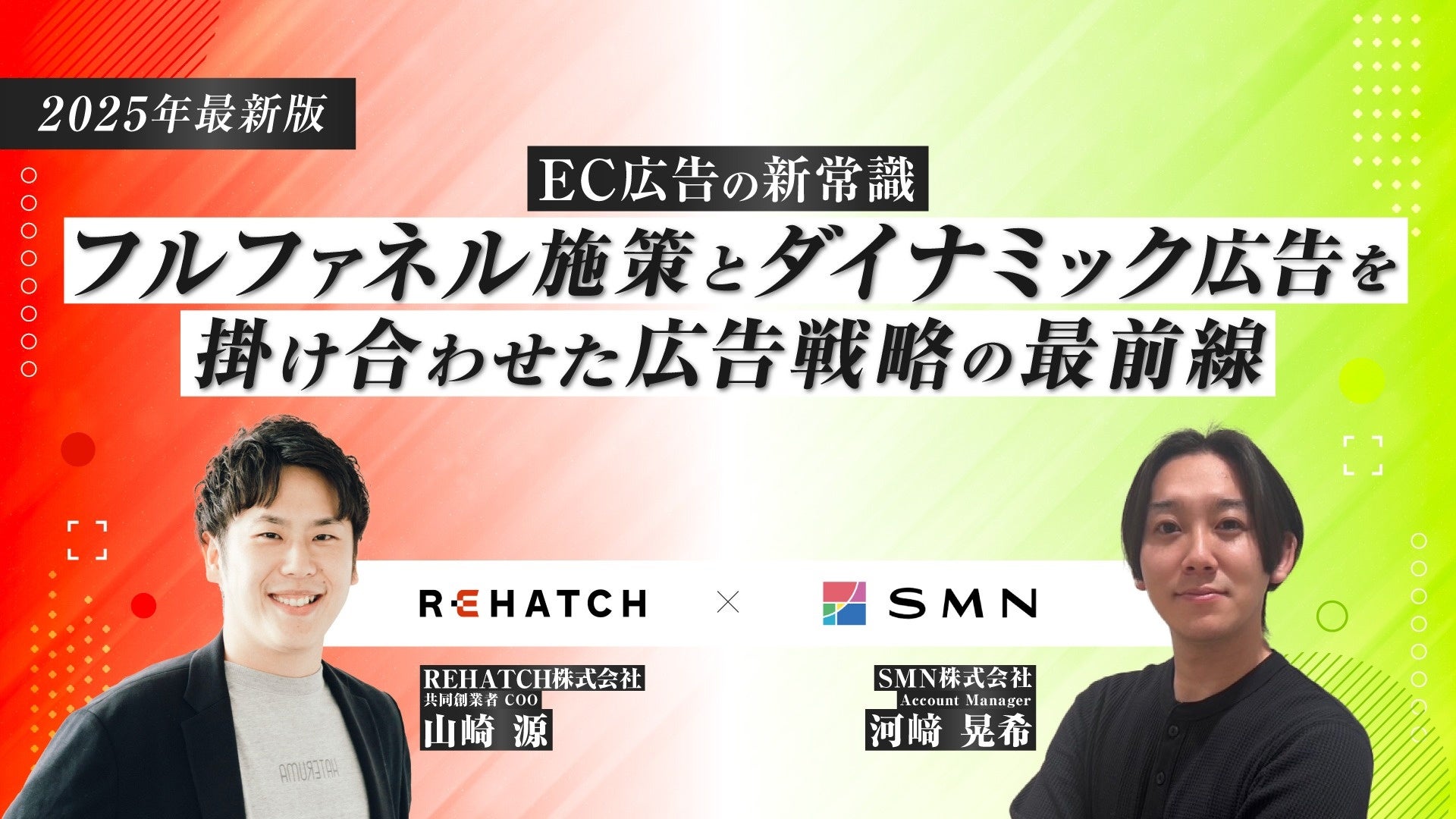 SMN株式会社(本社:東京都品川区、代表取締役社長:原山 直樹、以下SMN)は、REHATCH株式会社(本社:東京都千代田区、代表取締役:迫田 亮太、以下REHATCH)との共同ウェビナー「【2025年最新版】EC広告の新常識 フルファネル施策とダイナミック広告を掛け合わせた広告戦略の最前線」を2025年3月13日(木)に開催いたします。