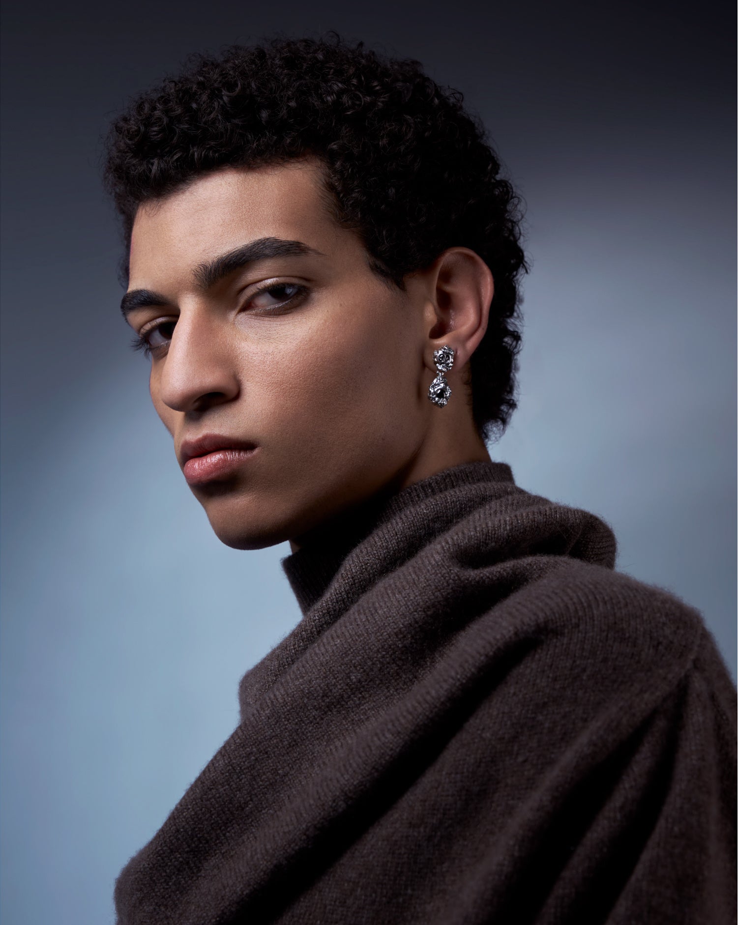 メンズ コレクションのために、輝きを放つ、均一な美しい肌を強調したナチュラル ルックを仕上げました。