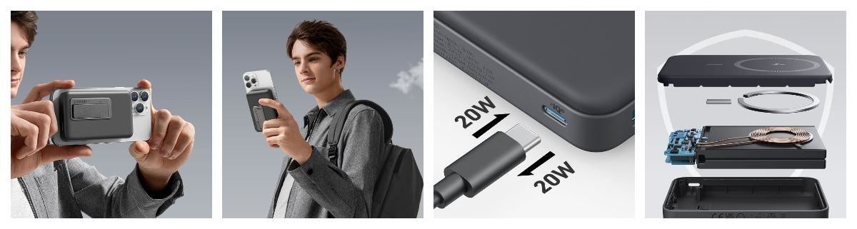 - パススルー充電に対応:本製品をUSB-C接続で充電しながら、お使いの機器にも充電が可能なパススルーワイヤレス充電に対応。ご自宅ではフリップ式のスタンドを使用して卓上のマグネット式ワイヤレス充電器として使用しながら、同時に本製品を充電することが可能。モバイルバッテリーの充電忘れを防ぐことができます。