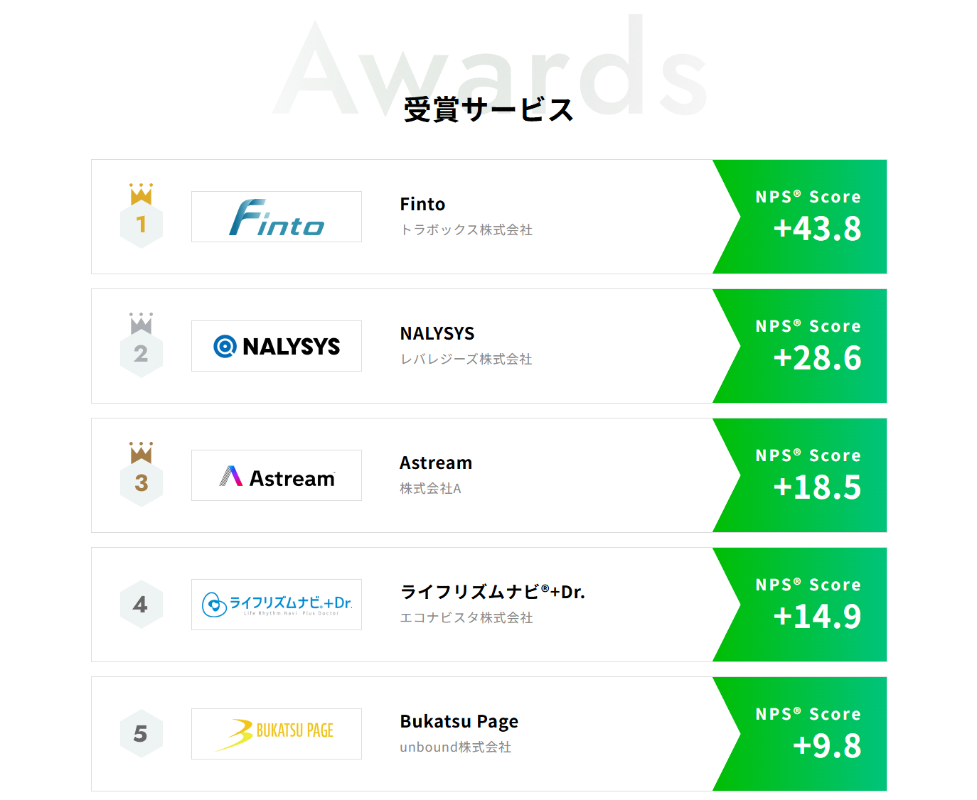 Fullstarを導入しているSaaS企業の中から、NPS®︎スコアが高い企業Top5を選出する表彰です。2025年11月までに集計されたアンケートデータ35,170件から高い評価を得られているプロダクトと卓越したカスタマーサクセス体制を持つ企業を選出します。