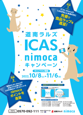 期間中、ICASnimoca電子マネーで決済された方を対象に、粗品のプレゼントや、nimocaポイントを進呈いたします。