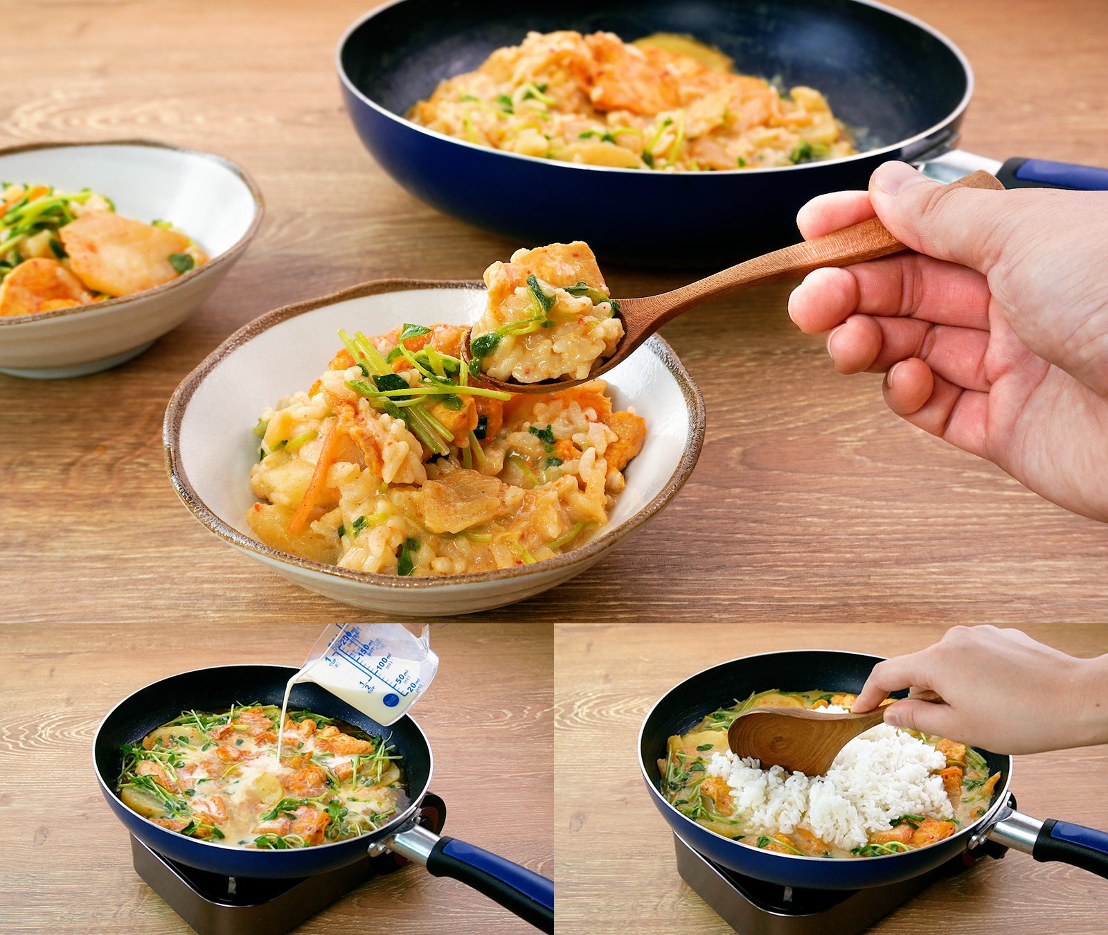 「フライパン蒸し鍋」の〆には豆乳を入れてリゾットにするのがおすすめです。つゆの水分量が少ないため豆乳の風味が引き立ち、もとの鍋とは一味違ったまろやかさを楽しめます。また、豆乳を追加することでたんぱく質を補うことができるのも嬉しいポイントです。