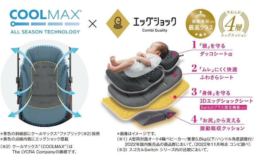 本商品は、2023年4月に発売したコンビ独自の卵を落としても割れないほどの超・衝撃吸収素材「エッグショック」を搭載した振動吸収最高クラス(※1)のベビーカー「スゴカルSwitch plus エッグショック ロッタ AS」モデルのシート部分に、吸水速乾に優れたクールマックス®ファブリック(※2)を新たに搭載したアカチャンホンポ限定のベビーカーです。素早い吸水と速乾で汗っかきな赤ちゃんの快適さをさらに追求しました。