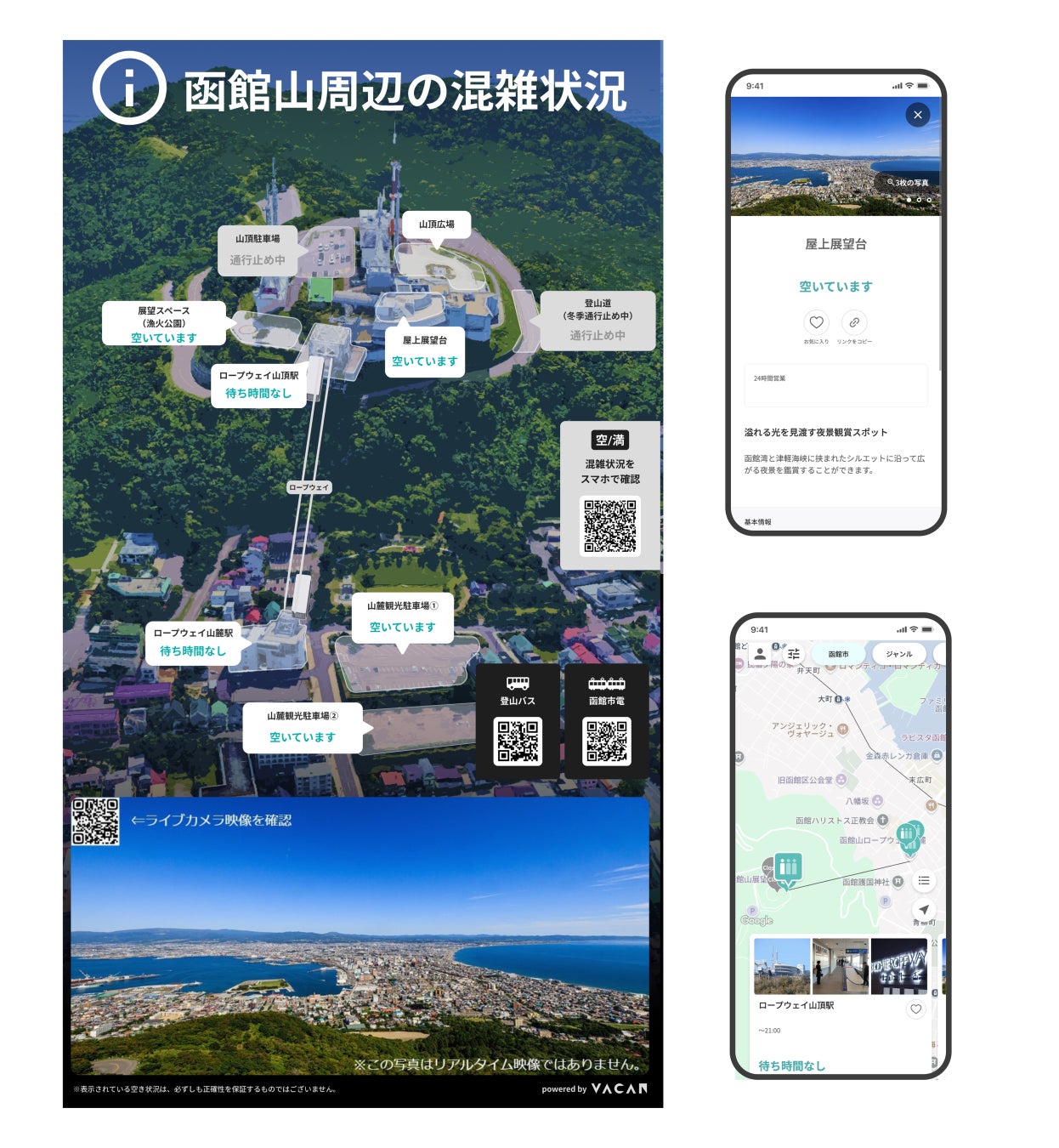 バカンの提供するAIカメラを用いて函館山周辺※の混雑状況をリアルタイムに可視化します。AIカメラにて検知した混雑状況は、「大混雑、混雑、やや混雑、空いています」の4分類で表示され、ロープウェイの山頂駅や山麓駅の混雑状況とあわせて2箇所のデジタルサイネージ(JR函館駅、アクロス十字街)やウェブサイトを通じて配信を行います。