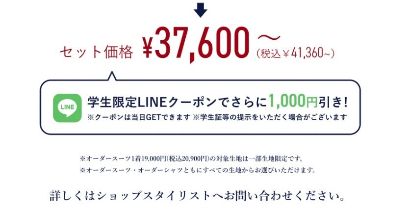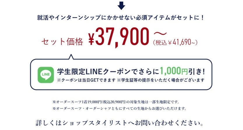 新たなプランの登場により、就職活動やインターンシップに必要なスーツやシャツを含むセットプランの選択肢が広がりました。用途やすでにお持ちのアイテムに合わせて、よりご自身に合ったプランを選びやすくなっています。さらに、学生の方限定でご利用いただけるクーポンもご用意しています。