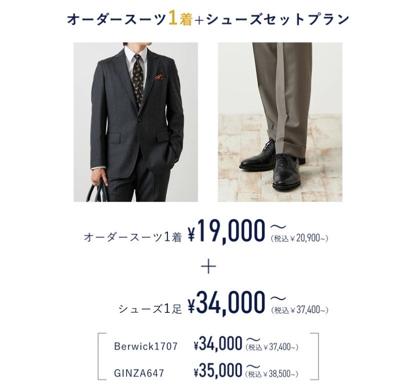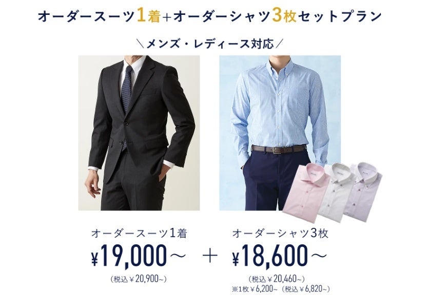 オーダースーツ1着+シャツ3枚セットプラン:37,600円~(税込41,360円~)