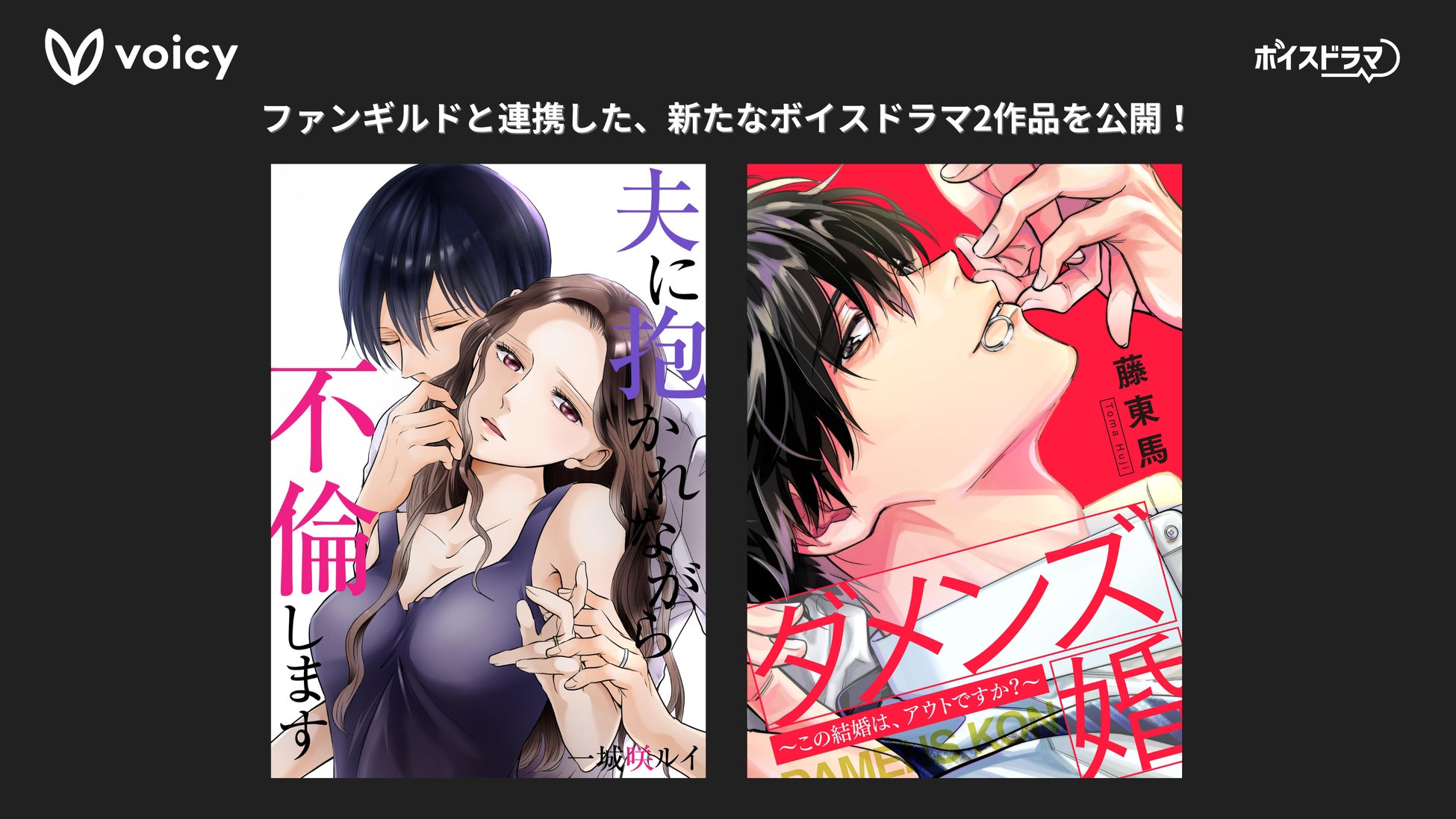 今回ボイスドラマ化し配信を開始するのは、ファンギルドから出版されているマンガ『夫に抱かれながら、不倫します』、『ダメンズ婚〜この結婚は、アウトですか?〜』の2作品です。