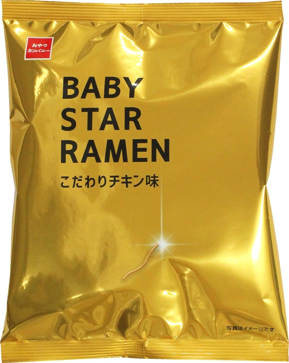 キラリと光る一本のベビースターが異彩を放つシンプルな金色のパッケージは、味へのこだわりの証。厳選した素材本来の旨みとコク深さ、香ばしさを感じられる“こだわり”のチキン味を、“いつも”のチキン味と食べ比べて、じっくりご堪能ください。