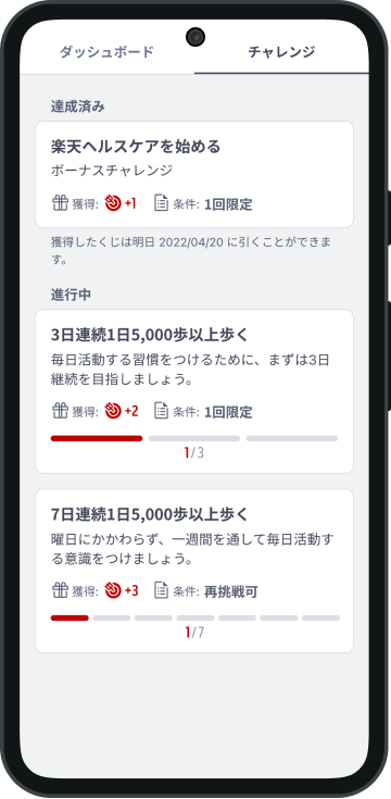 「身体活動記録」に連動したインセンティブ機能です。1日5,000歩を目標にしたデイリーチャレンジや、1日5,000歩を3日連続や7日連続で達成する連続チャレンジなどのイベントを提供しています。チャレンジイベントを達成すると、「楽天ポイント」が当たる抽選に参加できます。抽選で当たるポイントが変化したり、達成したチャレンジイベントの難易度に応じて参加できる抽選の回数が増えたりと、ゲーム感覚で楽しく継続できるコンテンツを加えています。