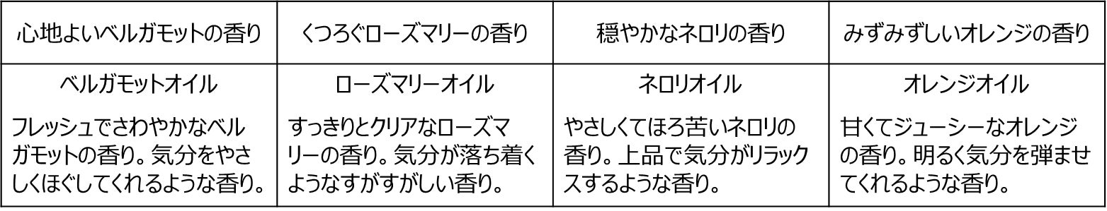 本製品は、各香料中にボタニカル精油を配合し、1箱で「心地よいベルガモットの香り」「くつろぐローズマリーの香り」「穏やかなネロリの香り」「みずみずしいオレンジの香り」の4種の香りを楽しめる入浴剤です。「アロマキープ処方」により香りが長く続き、ボタニカルの香りが入浴中のリラックス空間を演出します。透き通る無色透明の湯色です。
