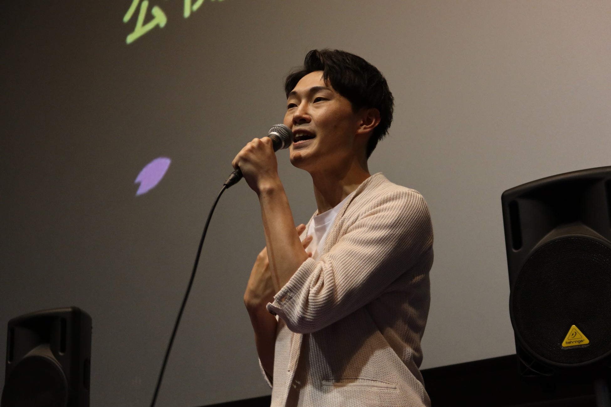映画『劇場版 おいしい給食 卒業』の主題歌を担当した鶴魁道さん。公開記念舞台挨拶で、歌唱を披露しました。