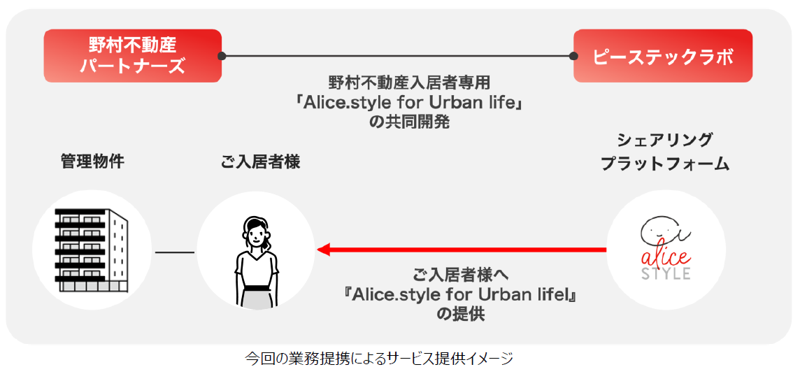 野村不動産パートナーズ株式会社(本社:東京都新宿区、代表取締役社長:福田 明弘、以下「野村不動産パートナーズ」)は、モノのシェアリングサービス『アリススタイル』を運営する株式会社ピーステックラボ(本社:東京都渋谷区、代表取締役社長:村本 理恵子、以下「ピーステックラボ」)と12月20日から協業を開始、野村不動産パートナーズが管理する賃貸物件(「プラウドフラット」、「プライムアーバン」等)において賃貸借契約者限定サービス『Alice.style for Urban life』の提供を開始することをお知らせいたします。