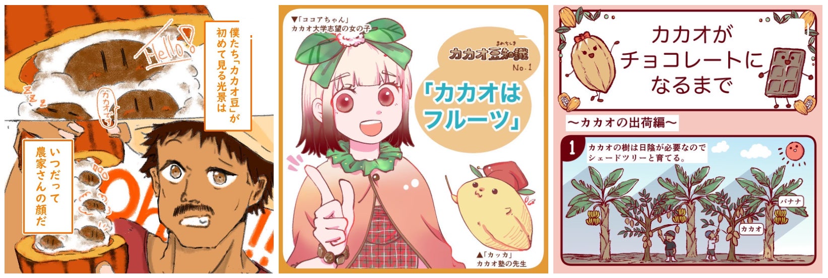 Instagram(https://www.instagram.com/sustainable_cacao/)では、日本サステナブルカカオ協会の活動の一環として、マンガコースの学生がカカオやサステナビリティについて学んだことを漫画にして掲載しています。