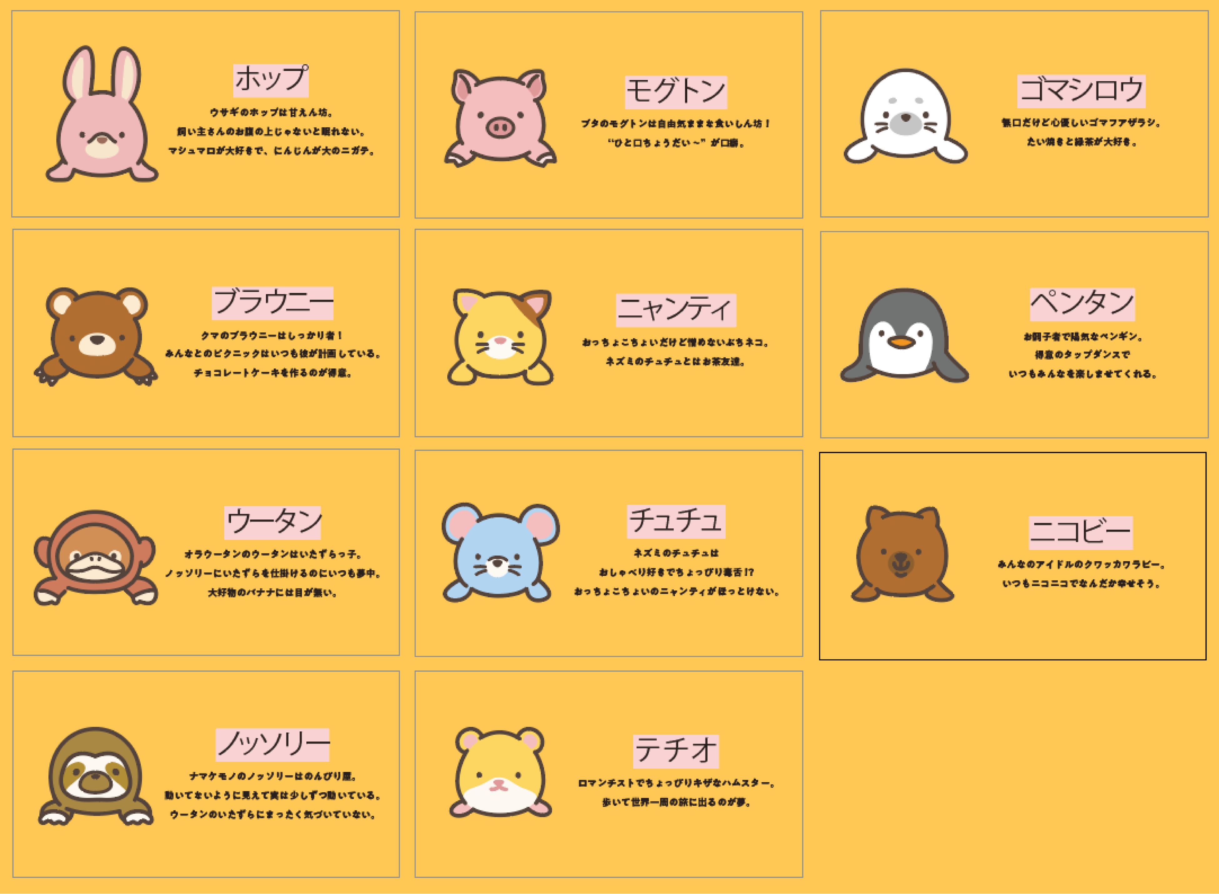 10種類のどうぶつの中から、お気に入りのふんばるずを見つけてみてください。