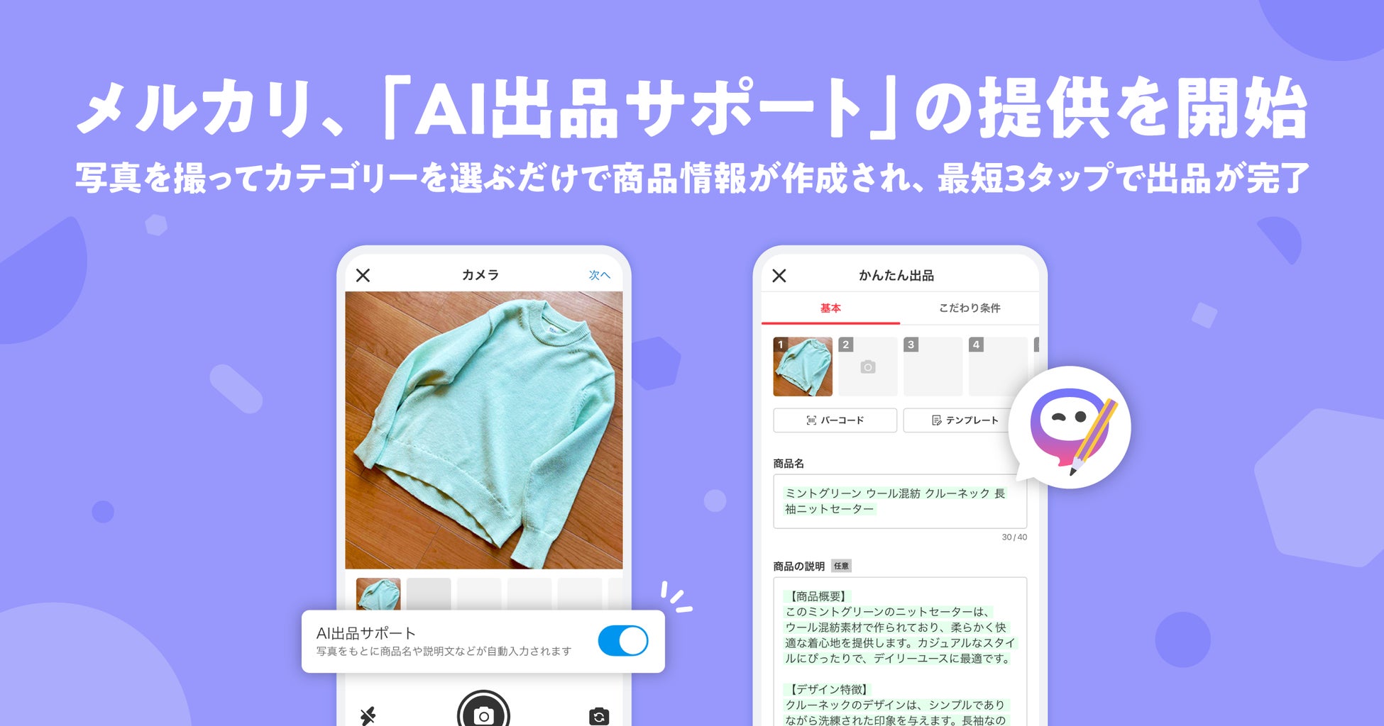 に写真を撮ってカテゴリーを選ぶだけで商品情報の入力が完了する新機能「AI出品サポート」の提供を開始したこと(※1)をお知らせいたします。これにより最短3タップで「メルカリ」への出品が完了します。