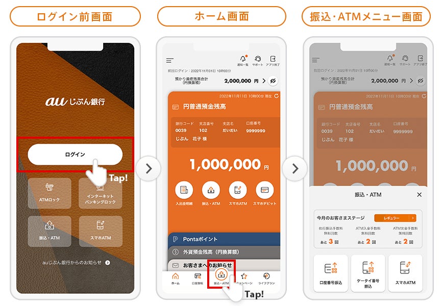 ログイン前画面とホーム画面には利用頻度の高いメニューなどを設置しました。また、振込やスマホATMをご利用時にじぶんプラスの手数料無料回数も同時に確認できるようになります。
