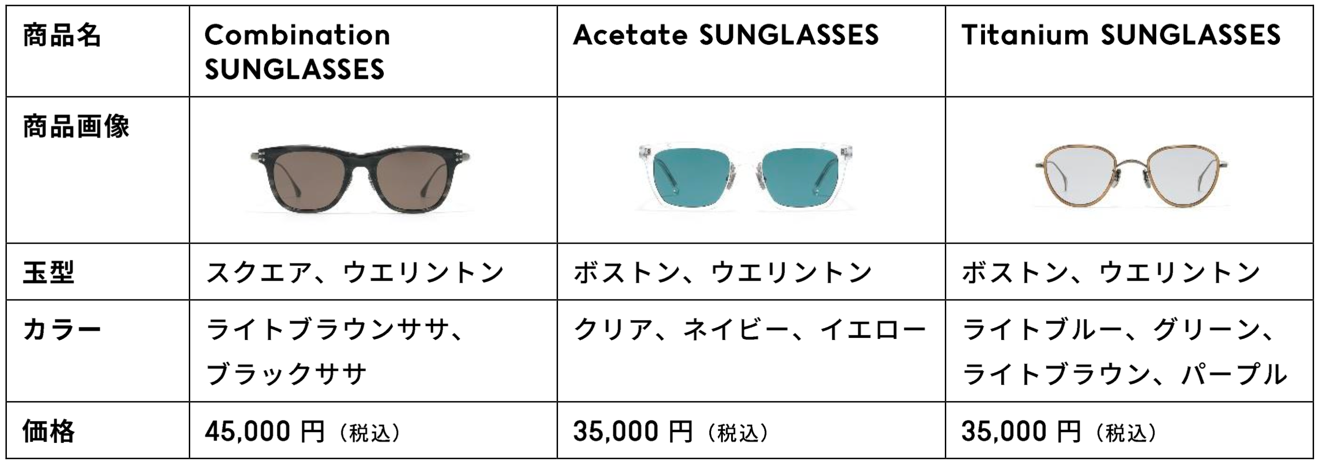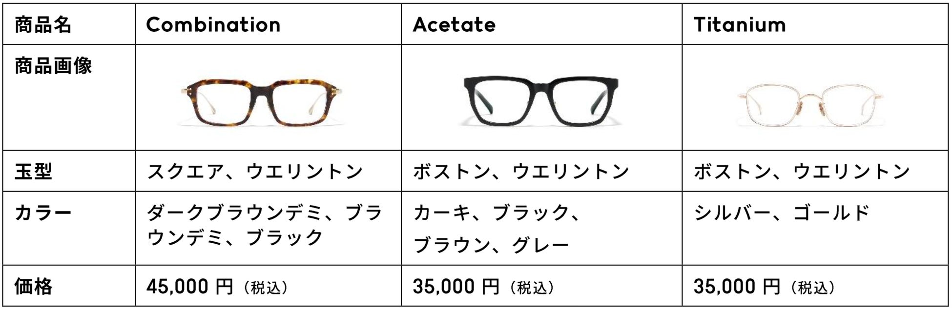 【価格】Combination ¥45,000 (税込) 、Acetate・Titanium ¥35,000 (税込)