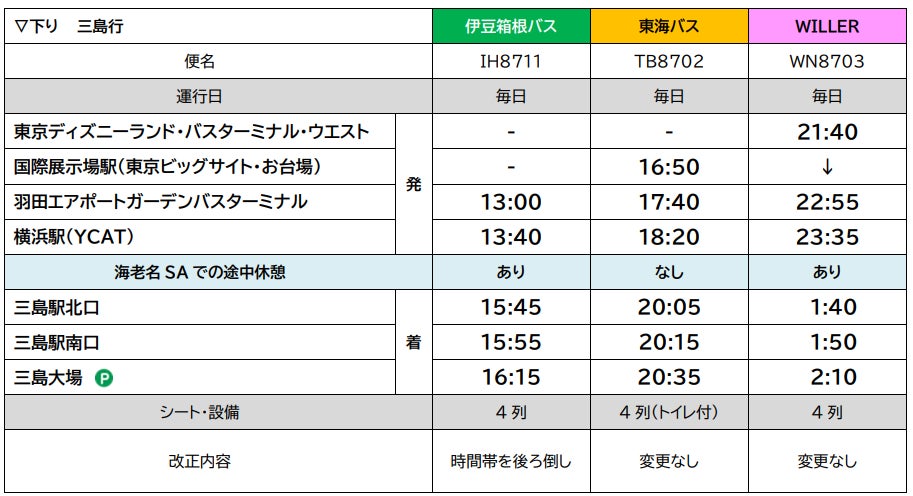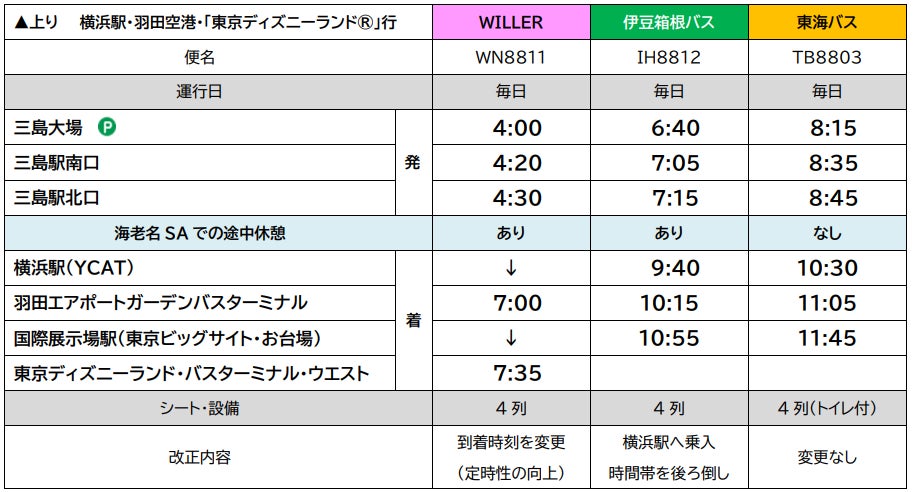 ・利用方法:「東京ディズニーランド®」・国際展示場駅・羽田空港・横浜駅発 ⇒三島行 の便を予約サイト「WILLER TRAVEL」(https://travel.willer.co.jp/bus/airport-bus/mishima-haneda/)で事前予約・決済