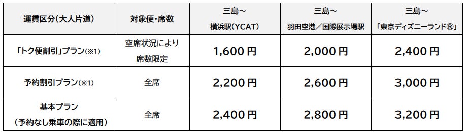 各便4席限定で基本プラン運賃から1,400円割引となる「バスで快適!キャンペーン」プランを、7月末まで販売します。最も安い三島~横浜駅(YCAT)の区間では、片道1,000円でご利用いただけます。また、WEBからの事前予約・決済時にご利用いただける「予約割引プラン」も通常時より割引を拡大し、基本プランから800円割引でご利用いただけます。