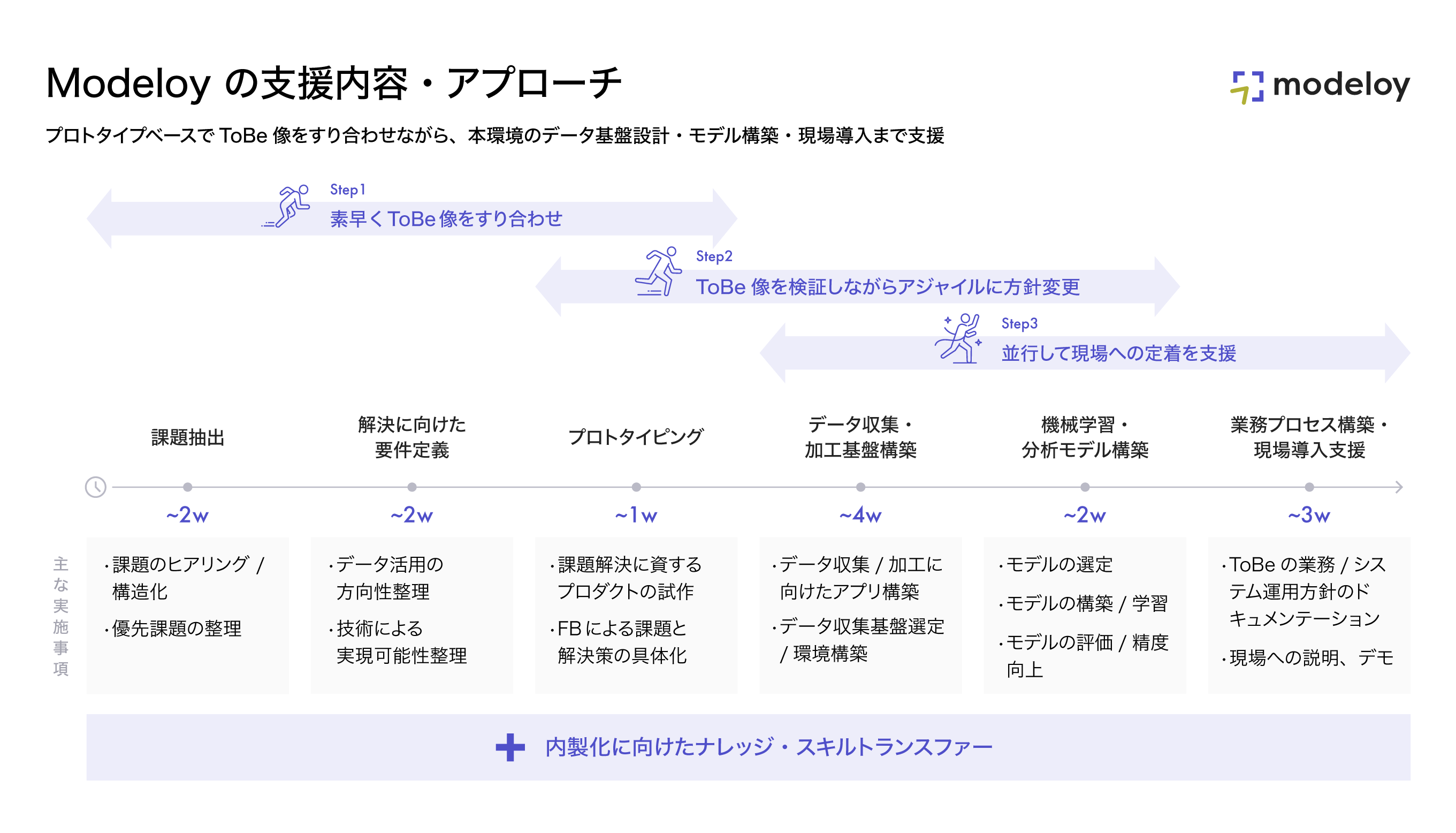クニミネ工業は従来より、DX人材育成に注力しており、その一環で2021年より2年間アイデミーの提供するオンラインDXラーニング「Aidemy Business」でAIやDXへの知見を深めてきました。本プロジェクトの実施にあたっては、「Aidemy Business」で学習を進めたクニミネ工業社員とプロジェクト伴走型支援「Modeloy」を展開するアイデミー社員が一丸となって取り組みました。
