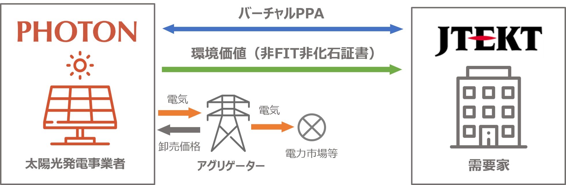 PPA(Power Purchase Agreement、電力購入契約)とは、発電事業者と需要家による直接の電力の売買契約。バーチャルPPAは「仮想の電力購入契約」を意味し、需要家の敷地の外に建設した再エネ発電所から、発電量に応じた電力を伴わない環境価値のみを取引するもの。需要家は電力の調達先を変更することなく非FIT(固定価格買取制度)非化石証書を調達できる。