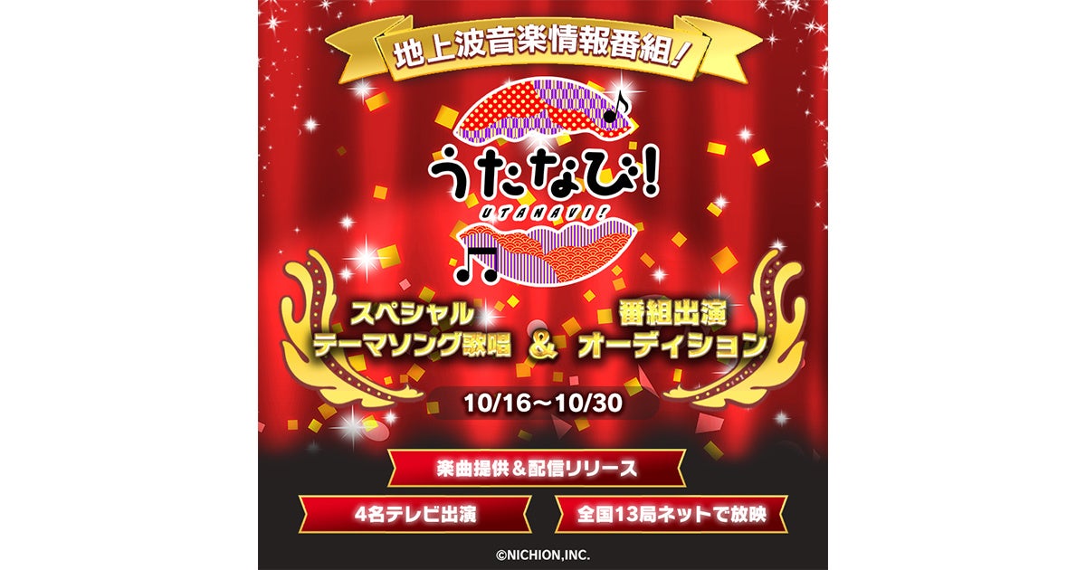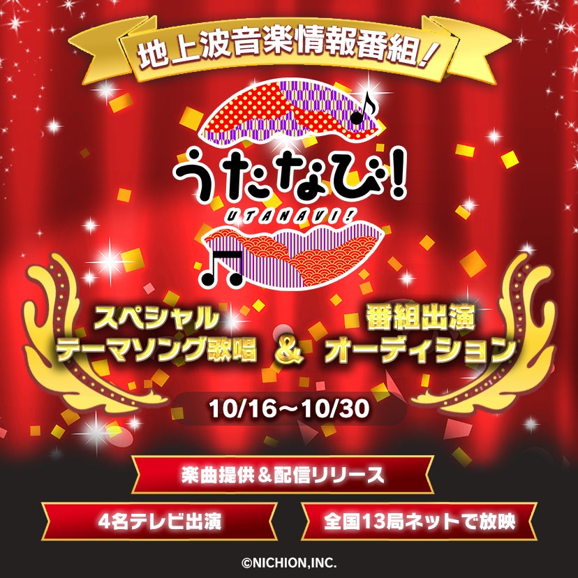 TOKYO MX他全国13局ネットで放送中の人気音楽情報番組『うたなび!』に出演できる!「地上波音楽情報番組『うたなび!』スペシャルテーマソング歌唱&番組出演オーディション!」開催!