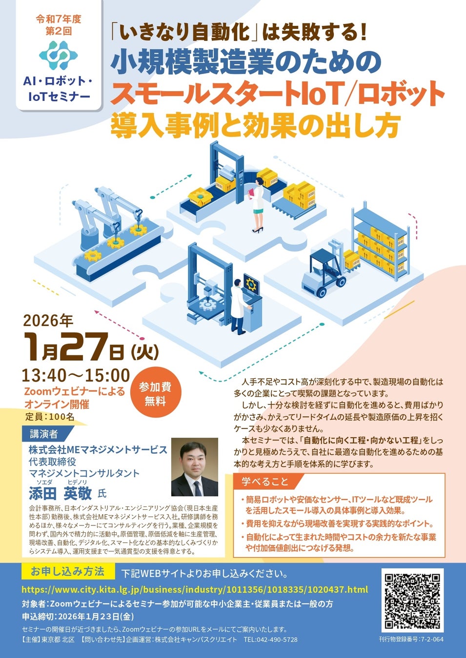 東京都北区では、2026年1月27日(火)、ZoomウェビナーにてAI・ロボット・IoTセミナー