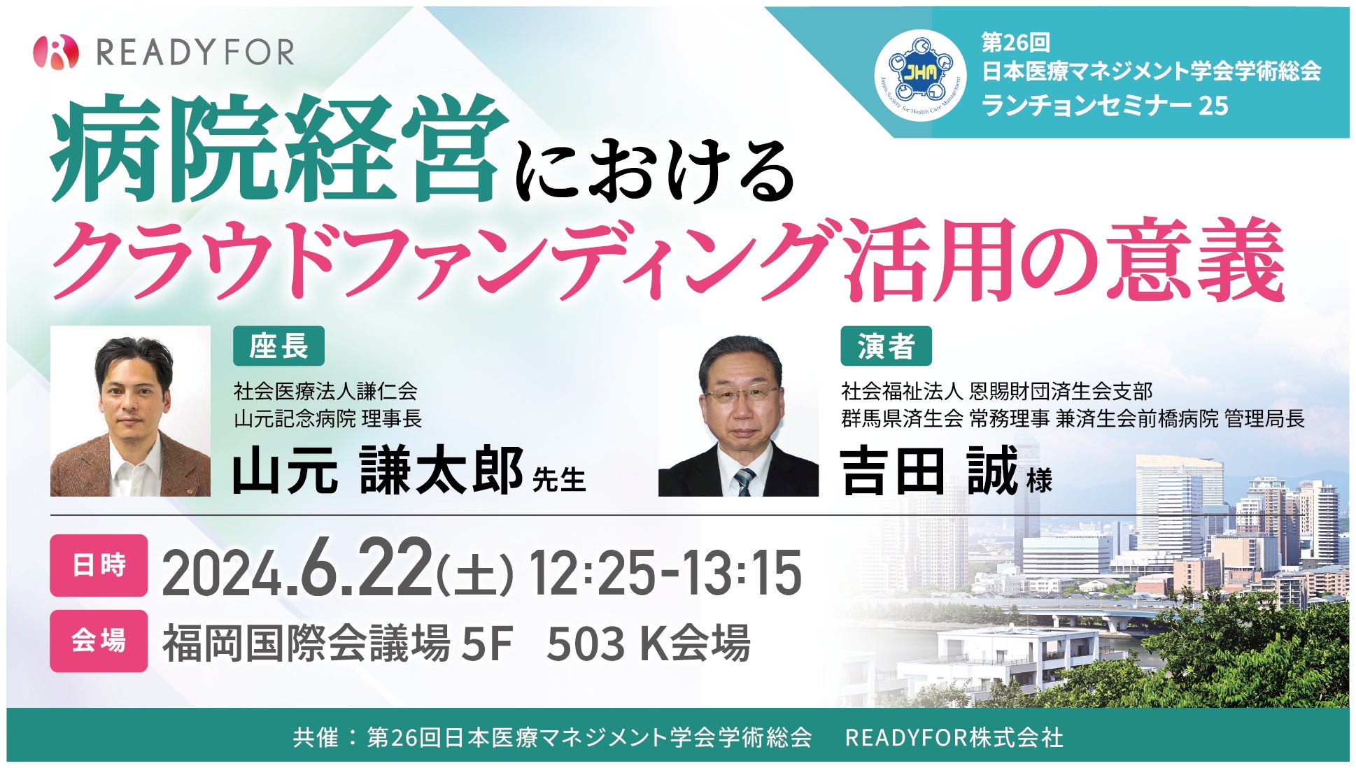 日本初・国内最大級のクラウドファンディングサービス「READYFOR」を運営するREADYFOR株式会社は、2024年6月22日(土)に第26回日本医療マネジメント学会学術総会(会場:福岡国際会議場)にてランチョンセミナー「病院経営におけるクラウドファンディング活用の意義」を開催いたします。