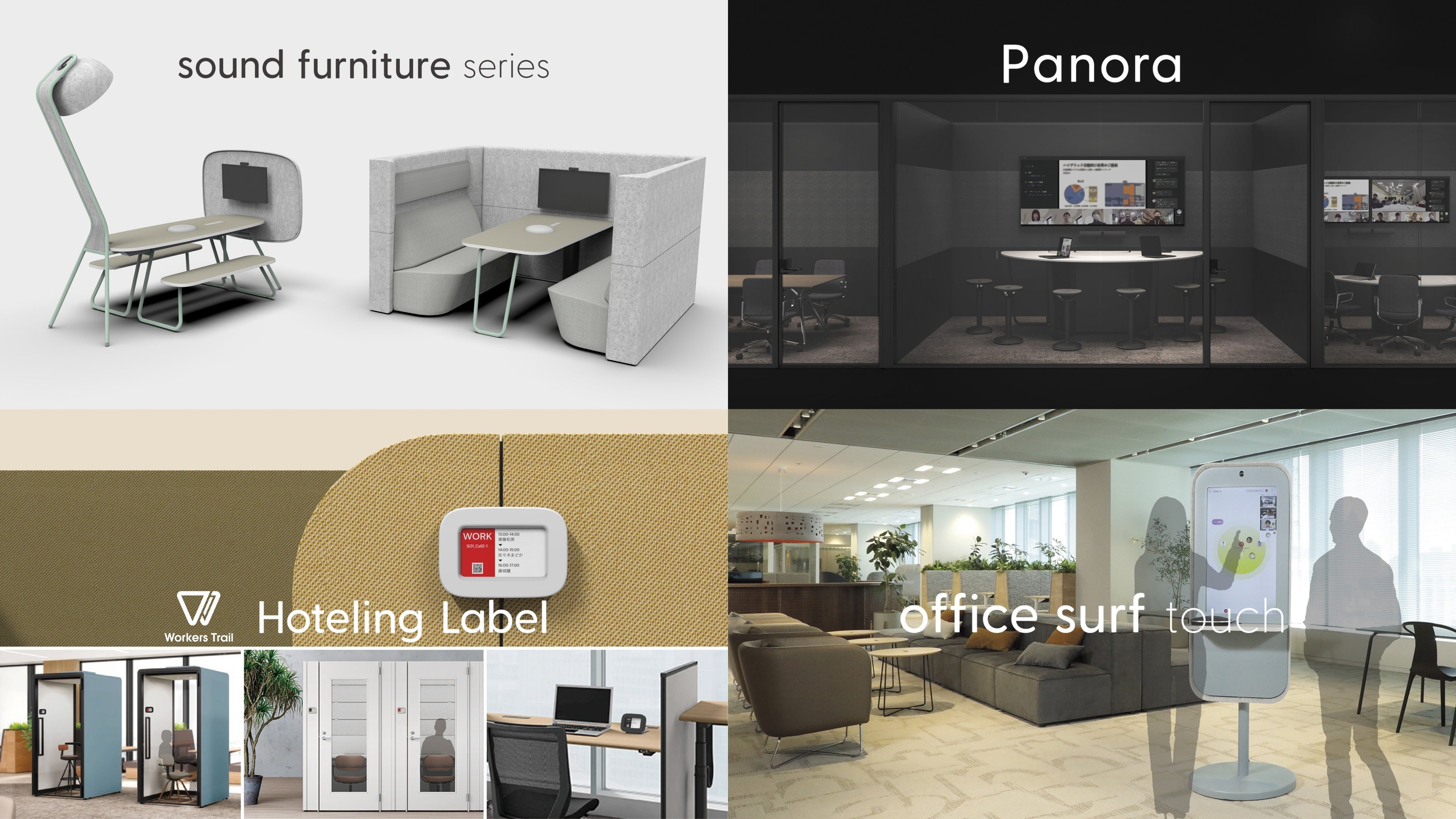 イトーキでは、Tech×Designのノウハウを生かし、ABWやハイブリッドによる新しい働き方の使い勝手をよくする製品群を拡充してまいります。”sound furniture series”に加え、シームレスなつながりを生むハイブリッド会議テーブル「Panora(パノラ)」、オフィスからワンタッチでバーチャルでもリアルでも繋がりたい相手と簡単に繋がる「office surf touch(オフィスサーフタッチ)」、ABWやフリーアドレスにおける集中デスクやブース予約を簡単にし、予約状況もその場で確認できる「Workers Trail Hoteling Label(ワーカーズトレイル・ホテリングラベル)」など、新製品を順次発売する予定です。