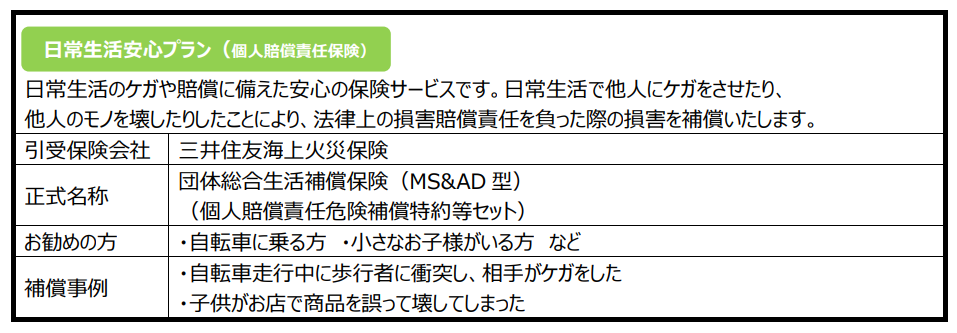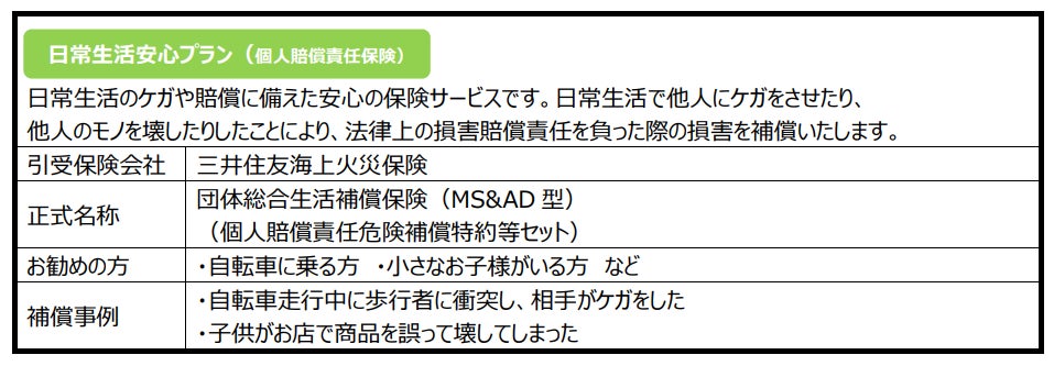 三井住友カードは、2022年4月14日より、国内初の、保険を選択できるカード付帯保険サービス「選べる無料保険」を提供しております。「選べる無料保険」は、従来の海外・国内旅行傷害保険だけでなく、身近なトラブルを補償したいというお客さまの声にお応えする、「日常生活安心プラン(個人賠償責任保険)」、「持ち物安心プラン(携行品損害保険)」、「ケガ安心プラン(入院保険(交通事故限定))」の4つのプランからお客さまが自由に選択できるカード付帯保険のサービスです。