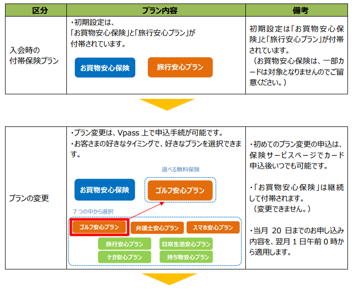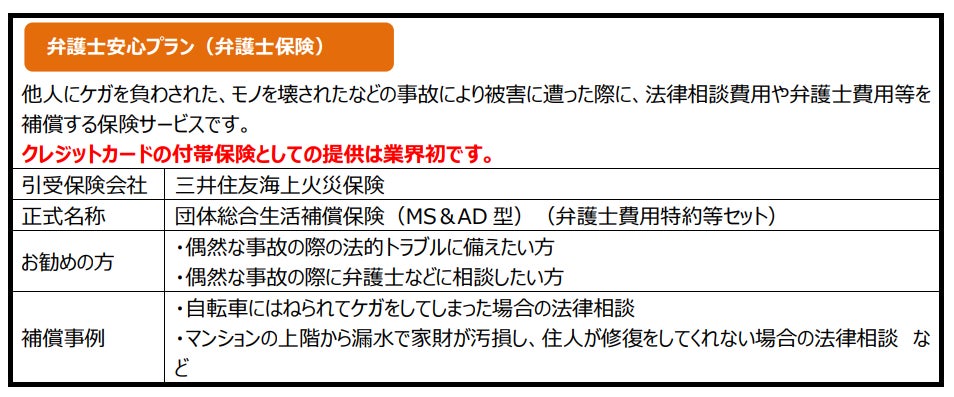 今般、さらに「ゴルフ安心プラン(ゴルファー保険)」、「弁護士安心プラン(弁護士保険)」、「スマホ安心プラン(動産総合保険)」の3つのプランを追加します。より一層、お客さまのあらゆるシーンでのトラブルにお応えできるサービスへレベルアップを図ります。なお、カード付帯保険は、「選べる無料保険」の他に、ショッピングを補償する「お買物安心保険」も提供しております。