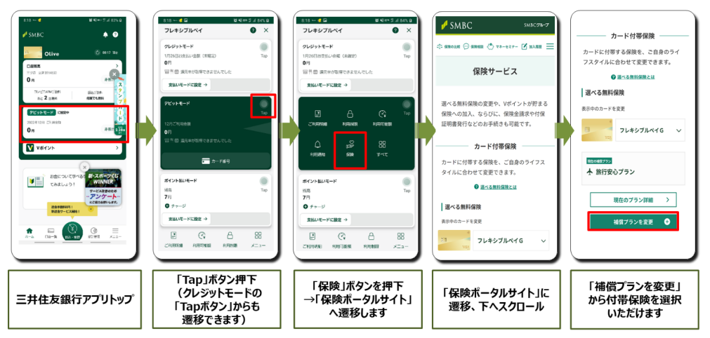 SMBCグループの個人のお客さま向けの総合金融サービス「Olive」をご利用のお客さまは、三井住友銀行アプリからもシームレスに付帯保険プラン変更のお手続きをいただけます。