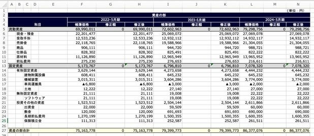 事前にAI-OCRで読み取った決算書から、貸借対照表、損益計算書、販売費及び一般管理費明細書、製造原価報告書の各項目を整理し、最大10期分の比較データを作成します。また各期を項目ごとに並べて表示しているため業績推移の把握に役立ちます。