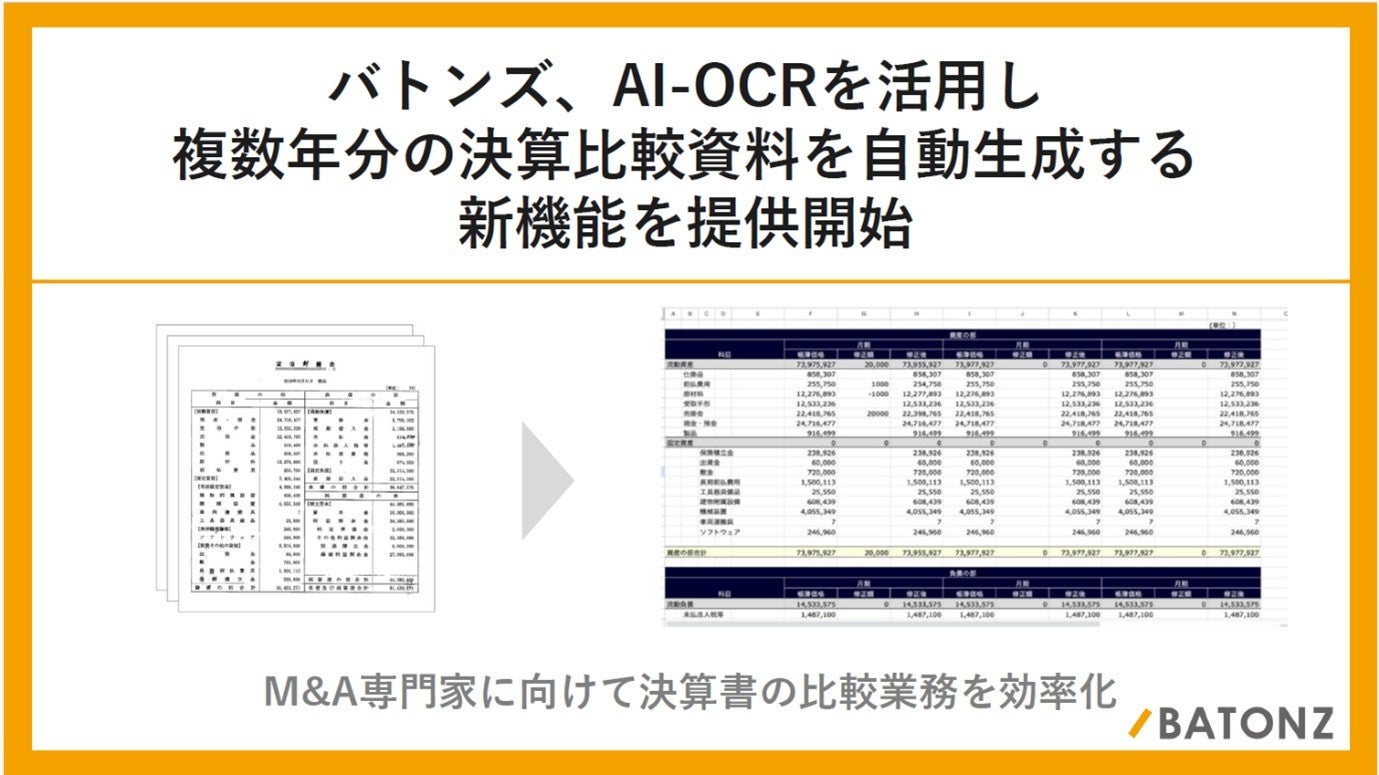M&A・事業承継支援プラットフォーム「BATONZ(バトンズ)」を運営する株式会社バトンズ(本社:東京都中央区、代表取締役CEO:神瀬 悠一、以下バトンズ)は、M&A専門家向けSaaS「BATONZ パートナープログラム」において、AI-OCRを活用して最大10期分の決算書の比較資料を生成できる新機能の提供を開始します。