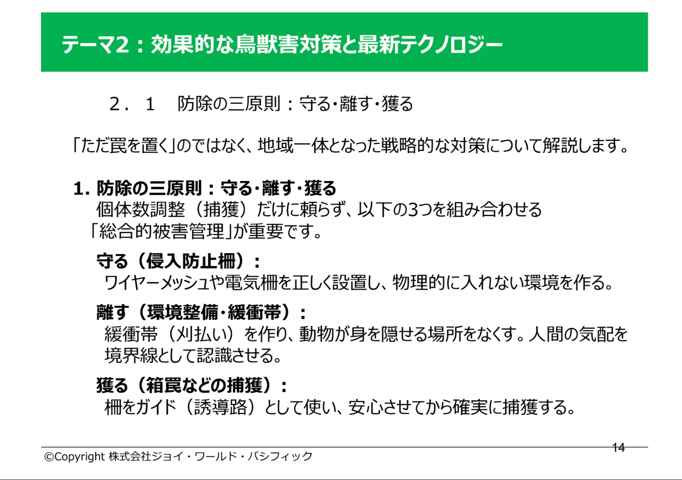 本セミナーで印象的だったのは、「罠猟は餌付けが8割」という現場の泥臭いノウハウと、IoTやAI物体検知といった最先端技術が、対立するものではなく互いを補い合っているという点です。