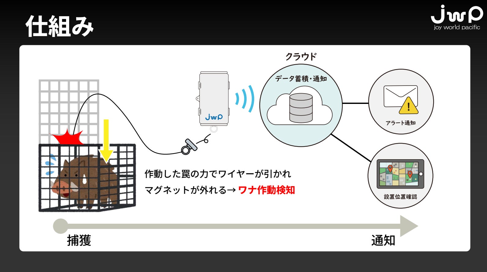 そのニーズに応えるのが、JWPが開発したIoT検知デバイス「ワナベル」です。後半のセッションでは、技術担当の佐藤氏からその仕組みと導入成果が共有されました。