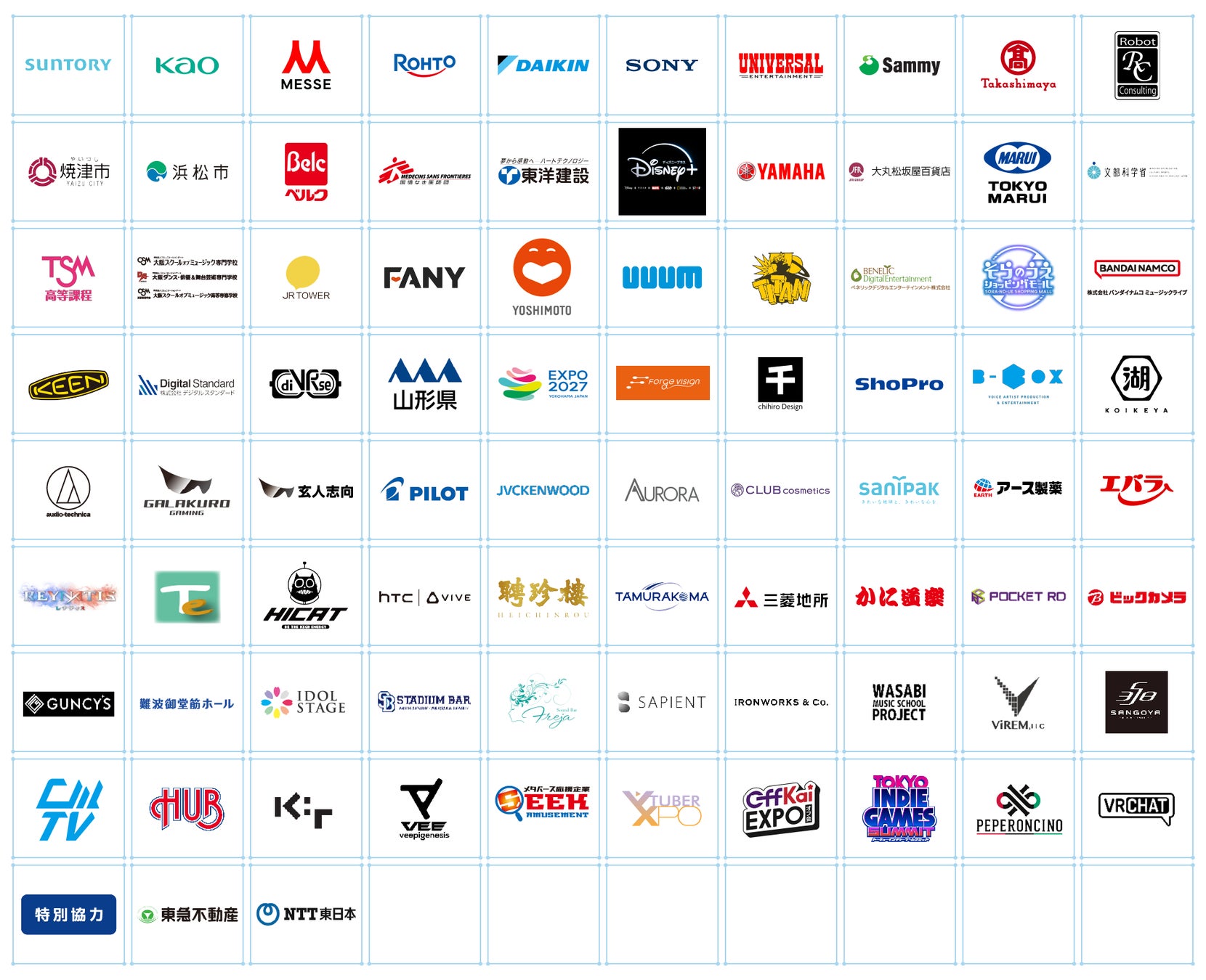 サントリー株式会社/花王グループカスタマーマーケティング株式会社/株式会社メッセホールディングス/ロート製薬株式会社/ダイキン工業株式会社/ソニー株式会社/株式会社ユニバーサルエンターテインメント/サミー株式会社/株式会社髙島屋/株式会社Robot Consulting/静岡県焼津市/静岡県浜松市/株式会社ベルク/特定非営利活動法人 国境なき医師団日本/東洋建設株式会社/ディズニープラス/ヤマハ発動機株式会社/株式会社大丸松坂屋百貨店/株式会社東京マルイ/文部科学省/SO.ON project LaV 東京スクールオブミュージック&ダンス専門学校 高等課程/大阪スクールオブミュージック専門学校/札幌駅総合開発株式会社/株式会社FANY(吉本興業ホールディングス株式会社100%子会社)/吉本興業株式会社/UUUM株式会社/株式会社タイタン/AMEMIYA/ベネリックデジタルエンターテインメント株式会社/株式会社バンダイナムコミュージックライブ/キーン・ジャパン合同会社/株式会社デジタルスタンダード/株式会社diVRse/山形県/公益社団法人2027年国際園芸博覧会協会/フォージビジョン株式会社/chihiro Design/株式会社小学館集英社プロダクション/株式会社 B-Box/株式会社湖池屋/株式会社オーディオテクニカ/GALAKURO GAMING/玄人志向/株式会社パイロットコーポレーション/株式会社JVCケンウッド/オーロラ株式会社/株式会社クラブコスメチックス/日本サニパック株式会社/アース製薬株式会社/エバラ食品工業株式会社/フリュー株式会社/T-entertainment 株式会社/HICAT/HTC NIPPON/株式会社聘珍樓/田村駒株式会社/横浜ランドマークタワー/株式会社かに道楽/株式会社PocketRD/株式会社ビックカメラ/株式会社 GUNCY'S/難波御堂筋ホール/秋葉原アイドルステージ/スタジアムバー 秋葉リーグ/Sound Bar Freja/株式会社サピエント/有限会社アイアンワークス/山葵音楽学校プロジェクト/合同会社ViREM/株式会社三五屋/株式会社サイバーメディアTV/株式会社ハブ/合同会社Kit/VEE/whole nine yards株式会社/株式会社シーク・アミューズメント/Vtuber Expo/OffKai Expo/TOKYO INDIE GAMES SUMMIT/ペペロンチーノ/VRChat