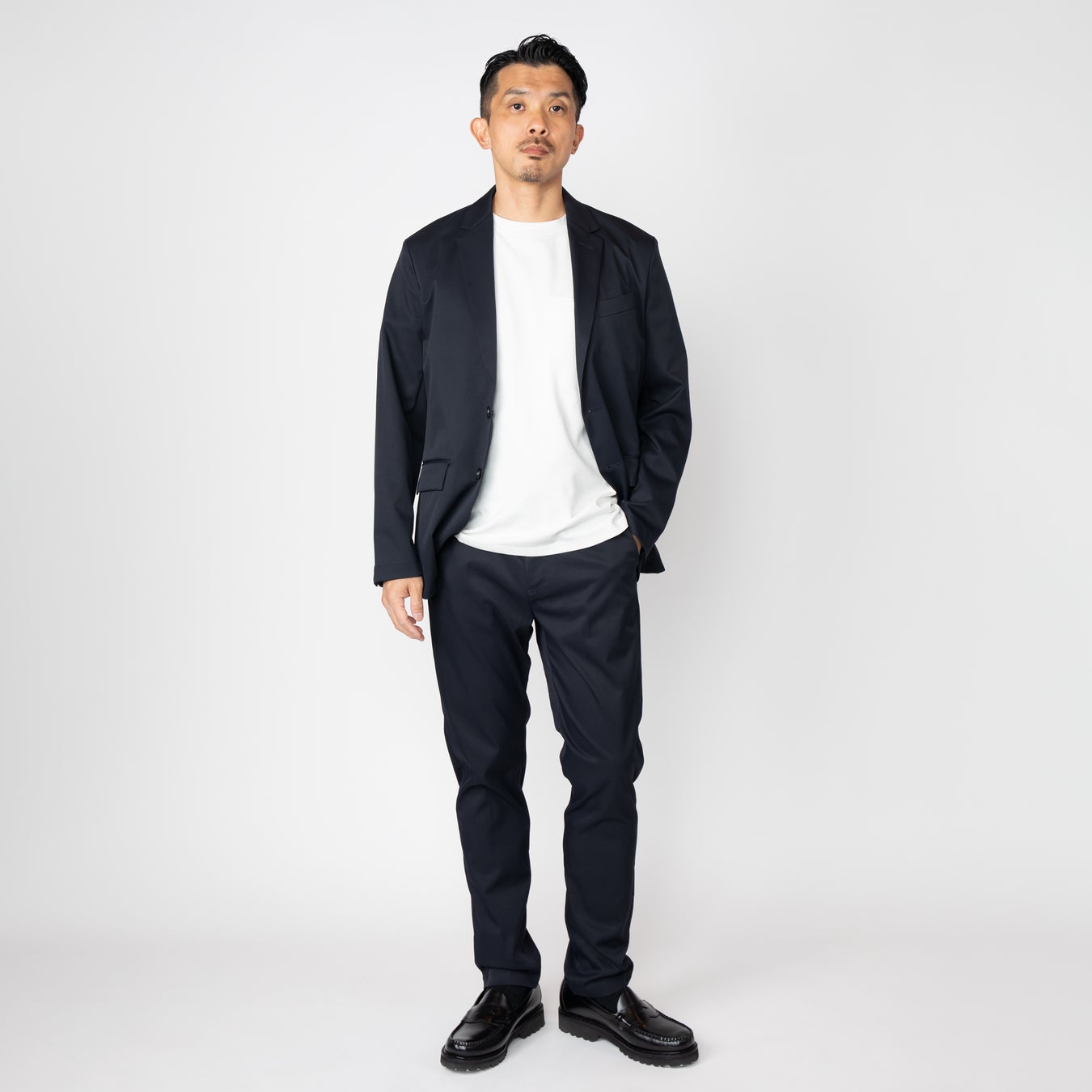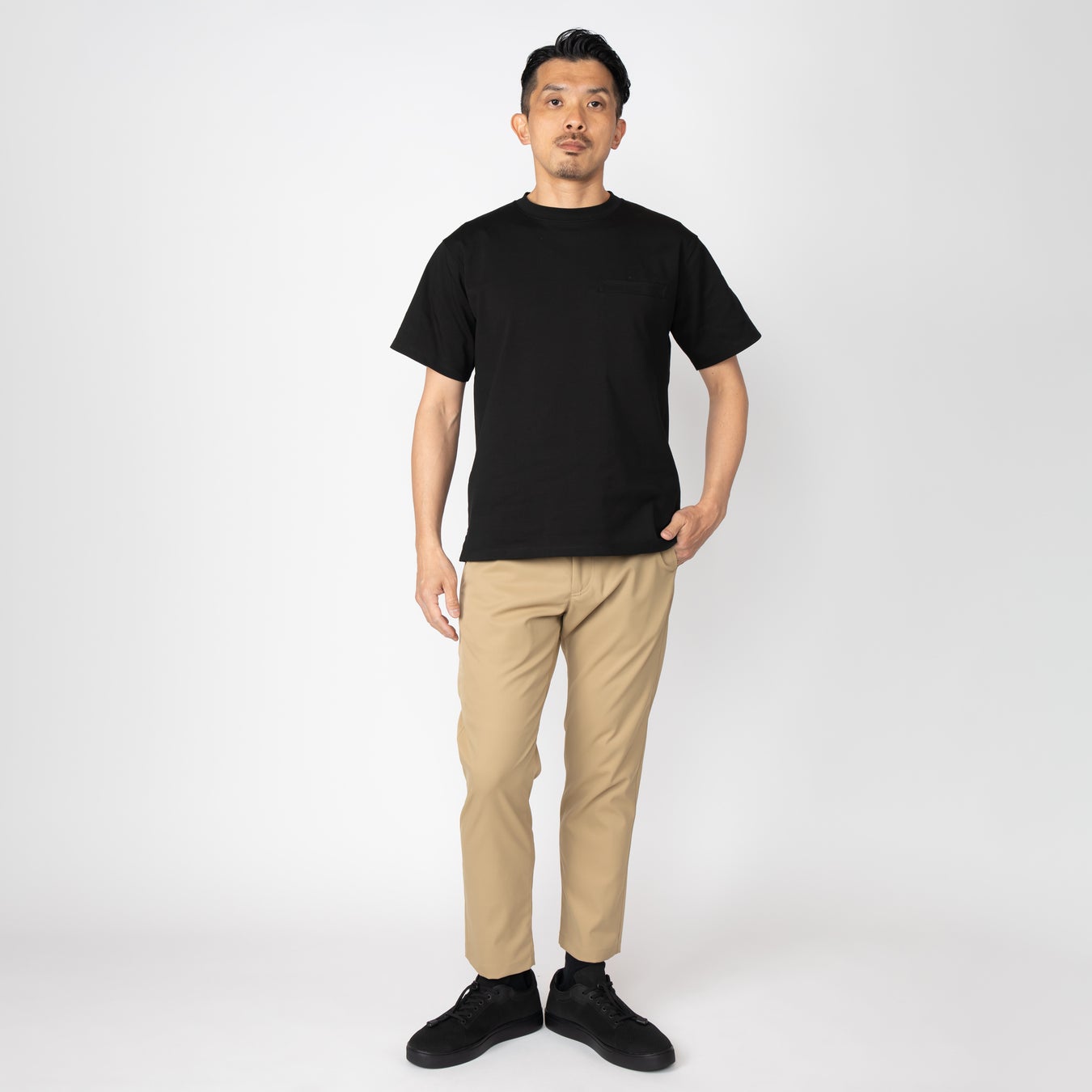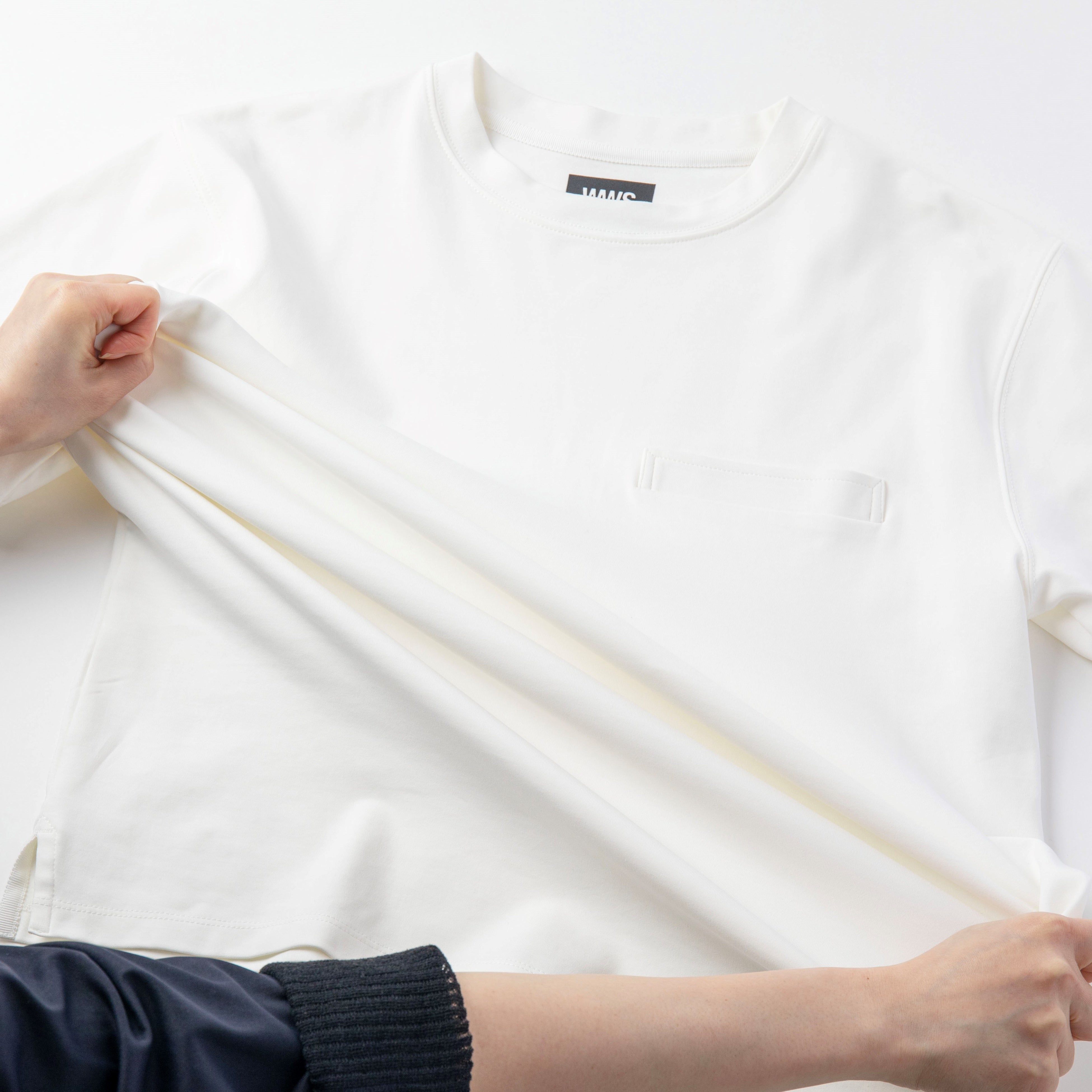 伸縮性と高耐久性に優れた繊維と綿の混紡により、洗濯後でもよれず型崩れしない肉厚でハリのある生地感とストレスフリーな着心地を実現。さらに摩擦に強い抗ピリング加工を施すことで毛玉が発生しにくく、接触冷感と速乾で汗ばむ季節でも快適に着用できます。