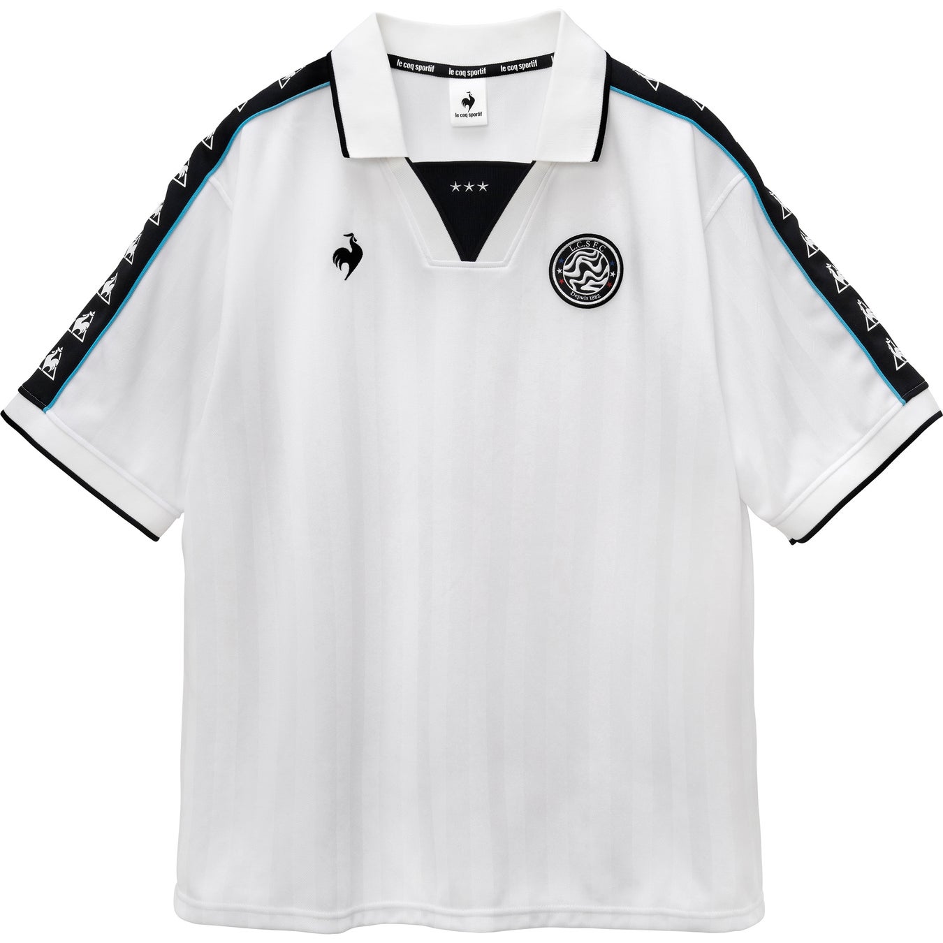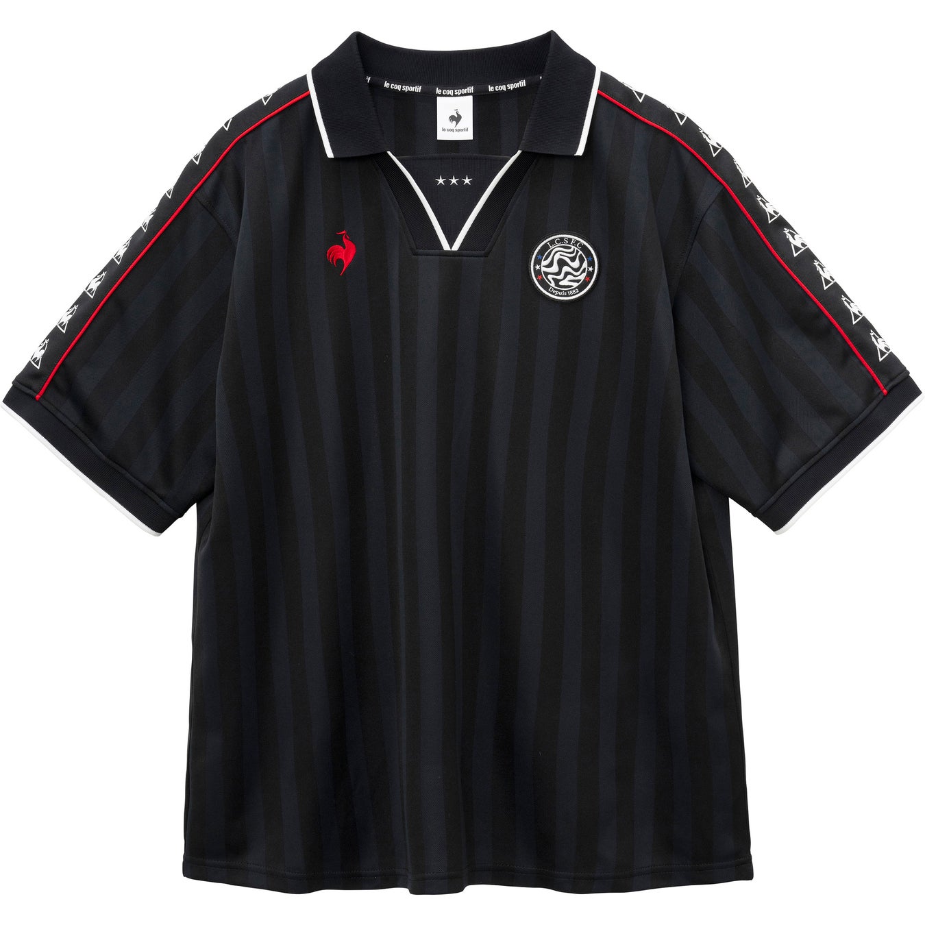 商品特徴:首元は少し広めに設計し、アクセサリーなどを付けてもすっきりとした見た目に。ストライプ柄の生地を採用し、左胸にオリジナルワッペンを配置することでフットボールデザインを演出しています。