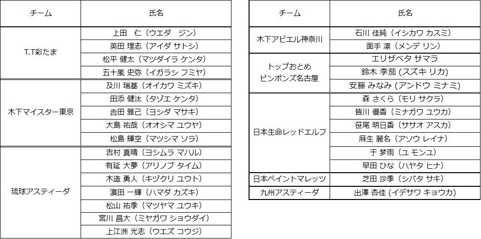 卓球のTリーグ 2022-2023シーズン 登録完了選手(2022年4月5日付)
