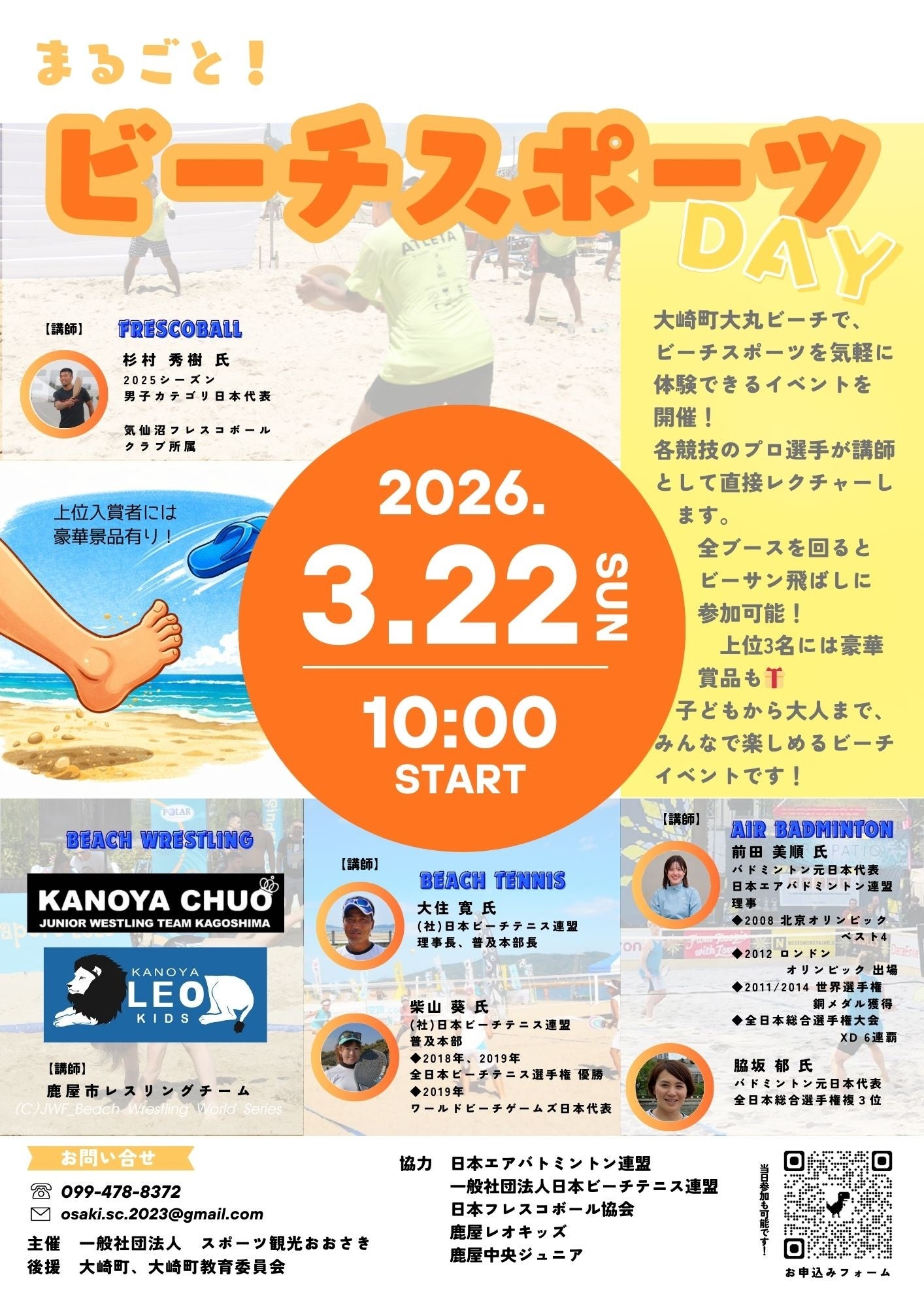 主催は、一般社団法人スポーツ観光おおさき。同団体はスポーツで大崎町を盛り上げることを目標にさまざまなスポーツイベントを開催しており、このたびのイベントが実現しました。今回は、各競技の第一線で活躍された講師が集結し、エアバドミントン・ビーチテニス・フレスコボール・ビーチレスリングを一日で体験できる“周遊型ビーチスポーツイベント”となっています。さらに、ビーサングランプリ(ビーチサンダル跳ばし)も開催!成績上位者には大崎町特産品がもらえるといいます。ぜひお気軽にお越しください。
