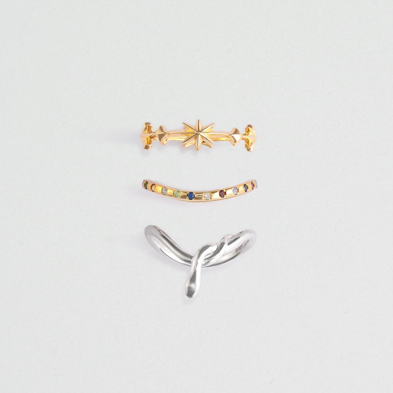 幸運のコンパスからインスパイアされたスターモチーフの地金リング、12星座にまつわる守護石を贅沢にセッティングしたハーフエタニティリング、富と叡智・生命力を象徴するスネークモチーフのV字リングの3本セット。