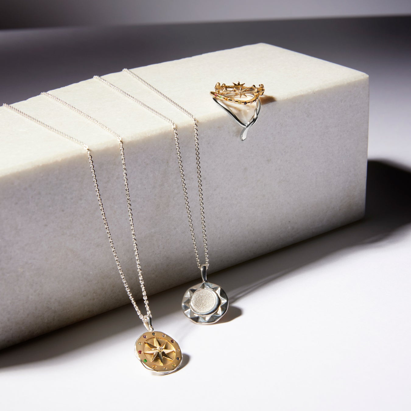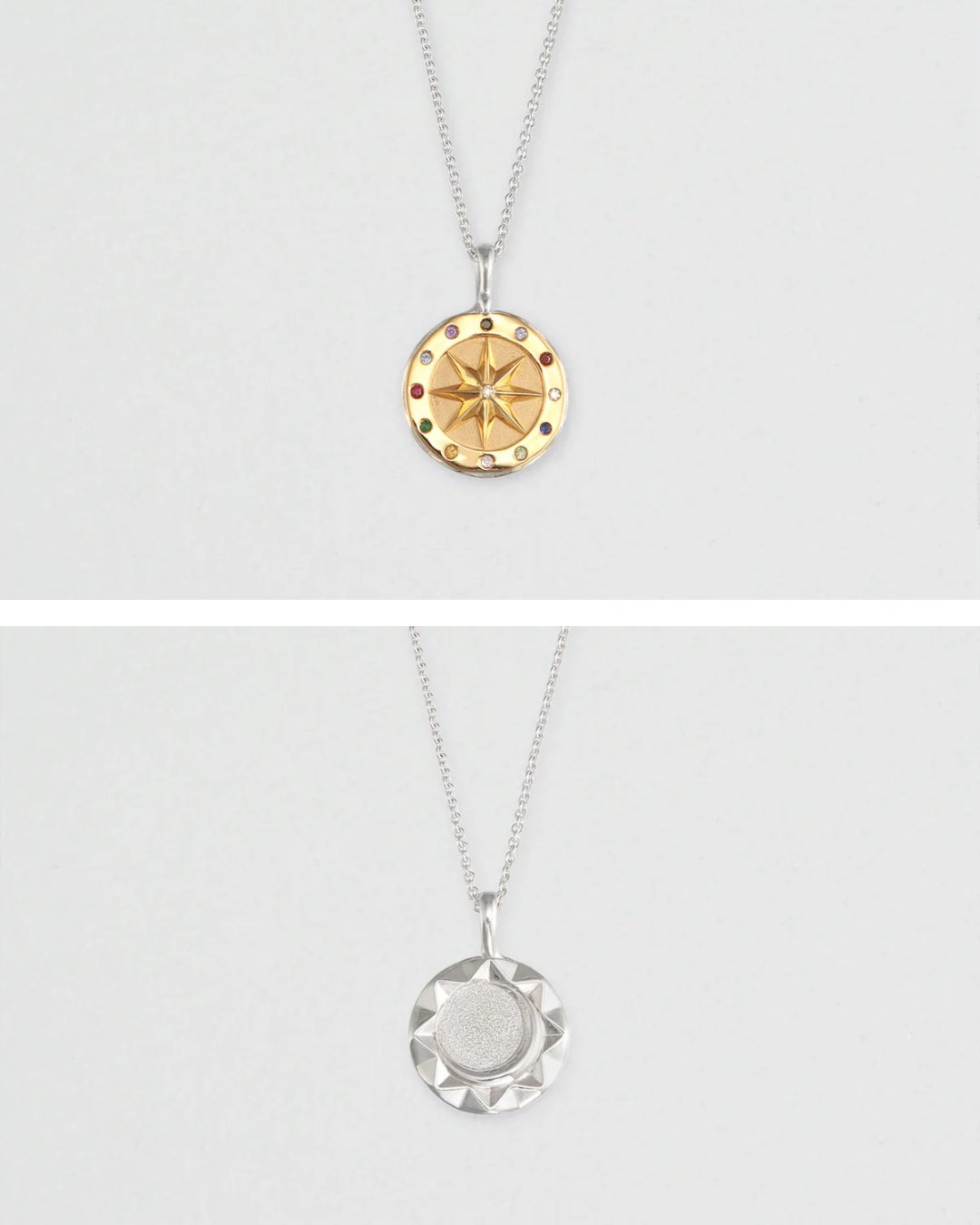 一番星のように進むべき道を指し示してくれる幸運のコンパスモチーフの周りに、12星座にまつわる守護石を贅沢にセッティング。