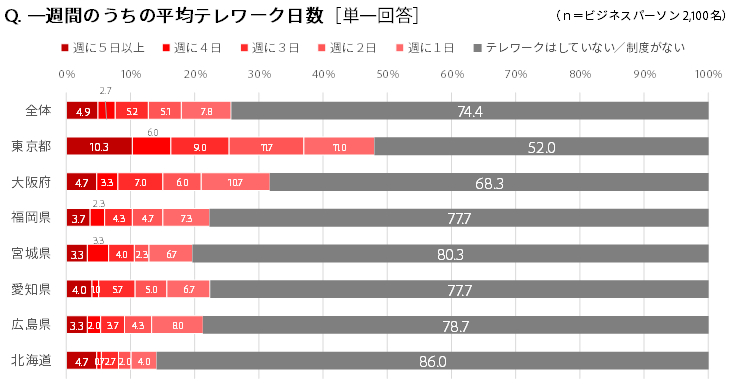ビジネスパーソンの現在の勤務状況については、テレワークを非実施が全体の74.4%となりました。地域別でみると、テレワーク実施者は東京都(48.0%)が最も多く、北海道(14.0%)が最も少なく、ここでも3倍以上の差があります。地域別で比較するとコロナ禍から3年以上が経過した今でも、東京都が他の道府県に比べ、テレワークを継続していることが分かりました。テレワークを実施している人の平均テレワーク日数は約2.67日/週になり、週の半分以上でテレワークを実施している結果になりました。