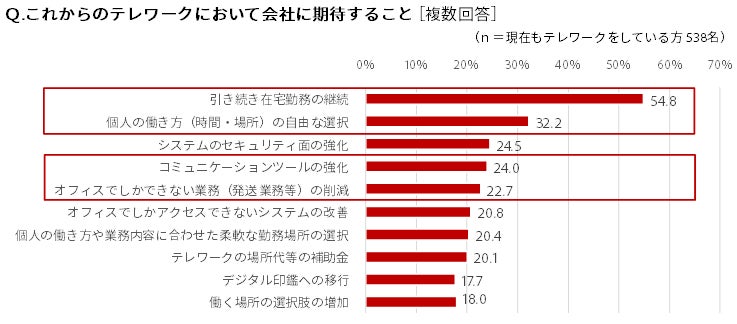 今後テレワークにおいて会社に期待することは「引き続き在宅勤務の継続(54.8%)」が最も多く、テレワーク実施者の約半数以上がこれからもテレワークの継続を希望しています。次いで「個人の働き方の自由な選択(32.2%)」を求める方が約1/3になりました。「オフィスでしかできない業務」や、「アクセスできないシステム」があるとテレワークが進まないという背景もあるため、会社に柔軟な働き方を実現するための環境面での改善を求める回答も多く見受けられました。