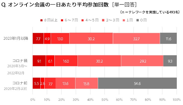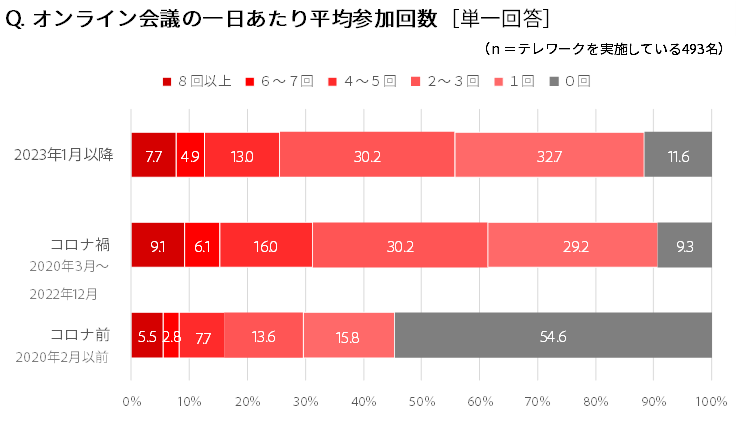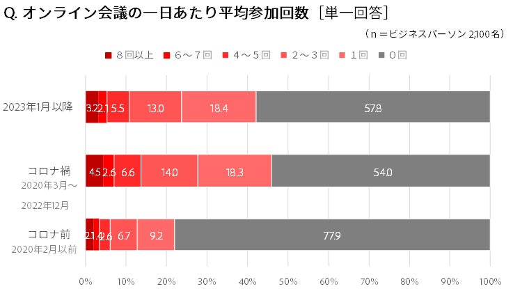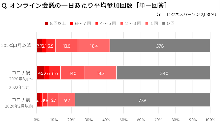 テレワークの利用を問わず、2023年1月以降では約42.2%のビジネスパーソンが、平均すると一日に1回以上、オンライン会議を利用しています。この結果は、コロナ前と比較すると約1.9倍となり、オンライン会議を日常的に業務に利用している人の割合が大幅に上昇していることがわかります。また、テレワーク利用者に絞ると約88.4%がオンライン会議を毎日利用、さらにテレワーク利用者の4人に1人、約25.6%は平均して一日あたり4回以上オンライン会議に参加しているという結果となりました。